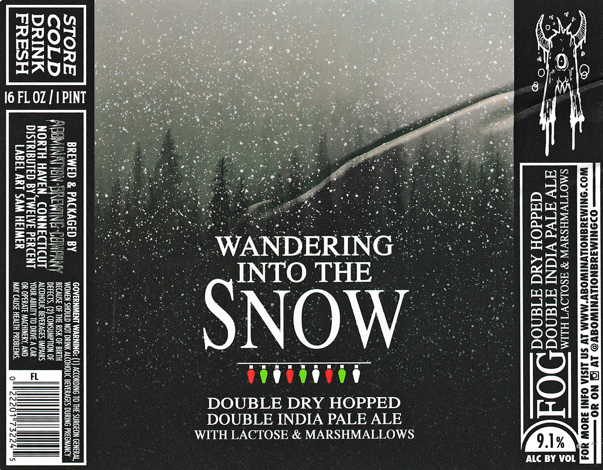 Abomination Wandering into the Snow Double Dry Hopped Double India Pale Ale with Lactose and Marshmallows pours to a hazy orange color with a thick fluffy white head and a nose of bright citrus and soft vanilla. Taking a sip, the beer is medium in body and immediately pulls the palate in two directions: bright and citrusy with orange and tangerine like a sunny day, but also fluffy and pillowy like a snowy one with marshmallow and vanilla. It finishes balanced but not really bitter, and while fun the competing flavors do seem incongruous to me.