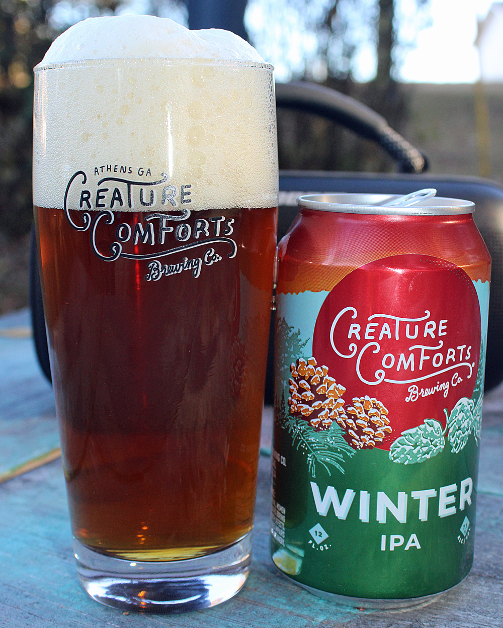 Creature Comforts Winter IPA pours to a bright russet color with a towering fluffy white head of foam and a nose of grapefruit and resiny pine. Taking a sip, the beer is rich and malty up front with juicy berry stewed malts and a hint of caramel. It quickly pops with resiny pine and bitter grapefruit rind.