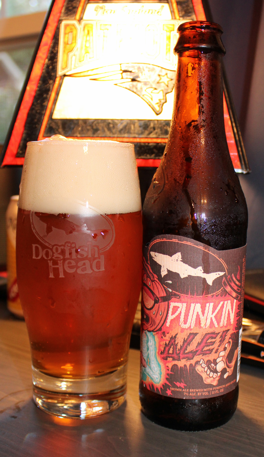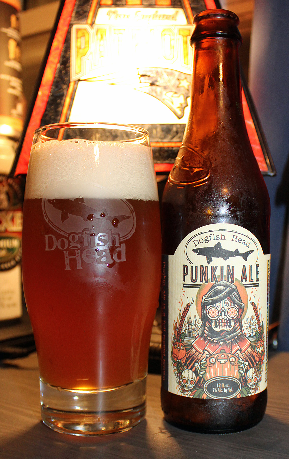 Dogfish Head Punkin Ale pours to a rusty copper color with a light, creamy head formation and a spicy, pumpkin pie nose. The palate is a bit thicker and firmer than most other pumpkin ales on the market, chewy with a little caramel, firm and full bodied with fleshy, stringy pumpkin flavor.