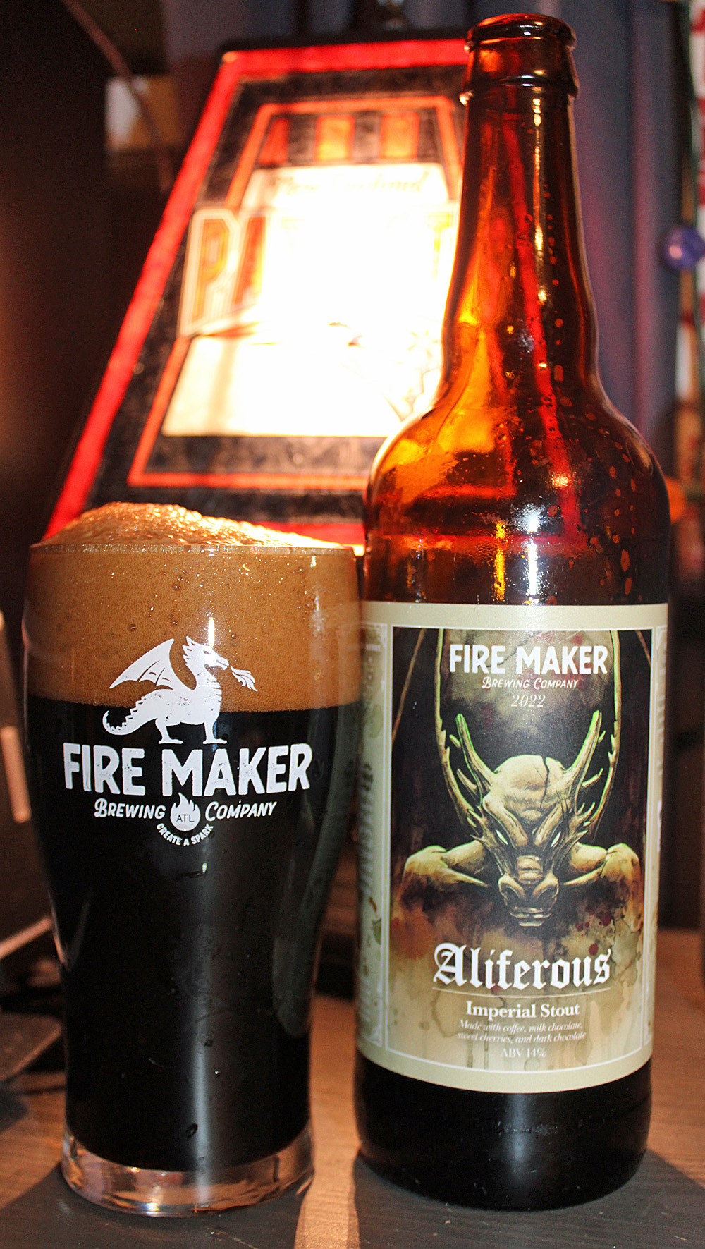 Almost three years ago, I hit the Fire Maker brewery in Atlanta as part of my annual birthday pub crawl. My kids were with me and handled the driving, and a fun time was had by all. One of the more memorable beers on that stop was a barrel aged version of their Aliferous Imperial Stout. They did not have the straight version on tap at the time, though I later picked up a bomber bottle at Total Wine. At least, I am pretty sure I bought it there. I might have bought it at the brewery, but I don’t think so