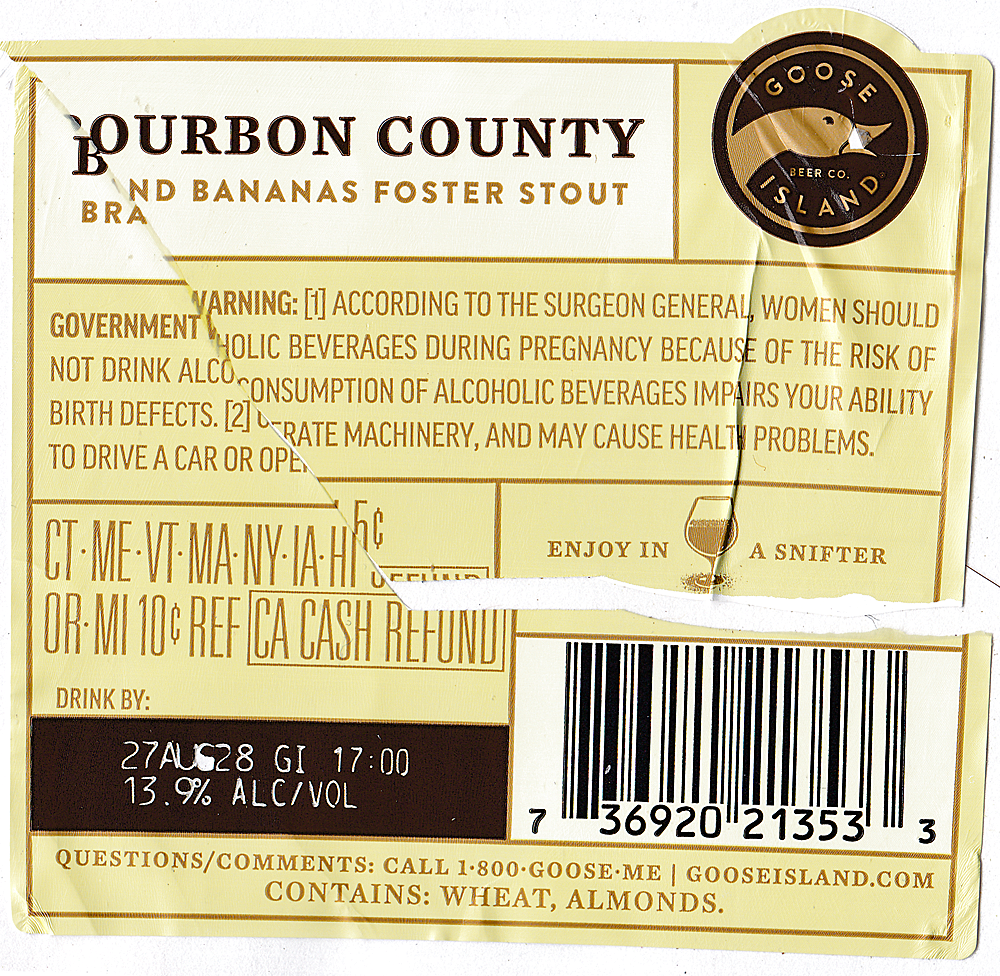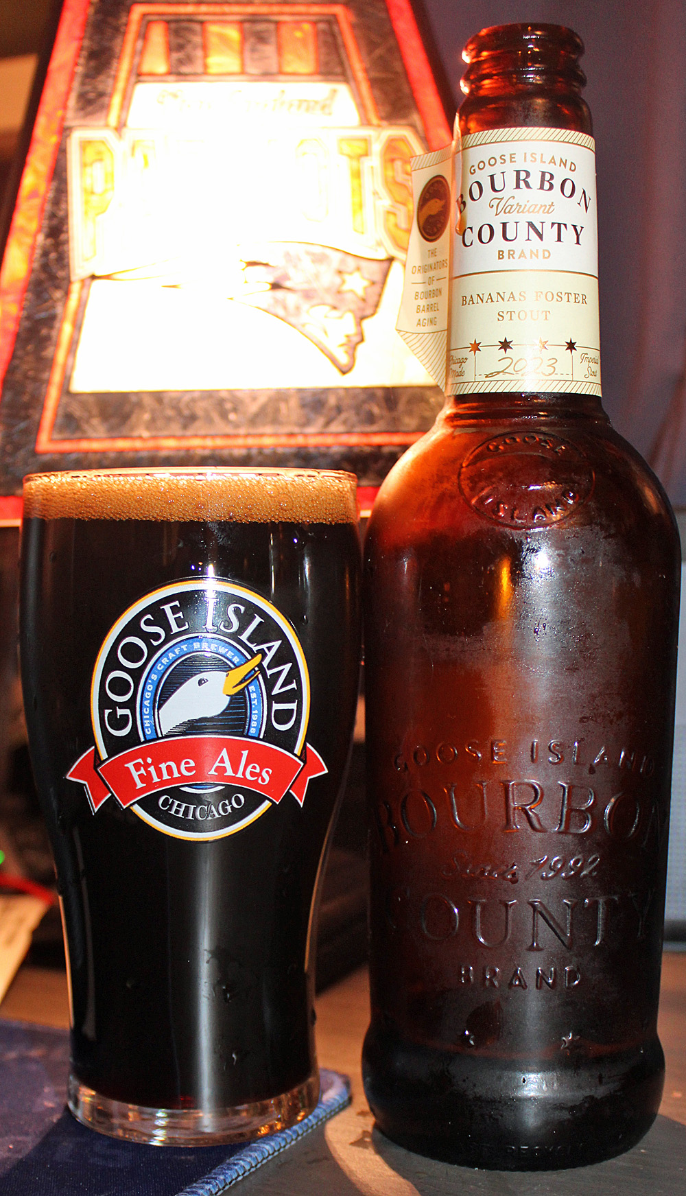 Goose Island Bourbon County Brand Bananas Foster Stout pours to a jet black color with a wispy thin head and a nose of boozy bourbon, bananas, and chocolate. Taking a sip, the beer is full bodied and rich, immediately hinting at bananas and cinnamon. Boozy bourbon notes quickly emerge along with chocolate and caramel, then the fruity banana. The beer finishes warming and boozy again with the bourbon and more of the cassia bark cinnamon notes. I might like vanilla for the ice cream of the classic dessert, and perhaps rum barrel aging might again be closer to that than bourbon is. Still, this is quite delicious, and I am really enjoying it with a year of age on it. The bourbon notes here are sublime, and while I do not get the almond (it’s such a delicate flavor and I fear lost in the midst of the stronger flavors), the banana does pop nicely against the dark malt and booze.