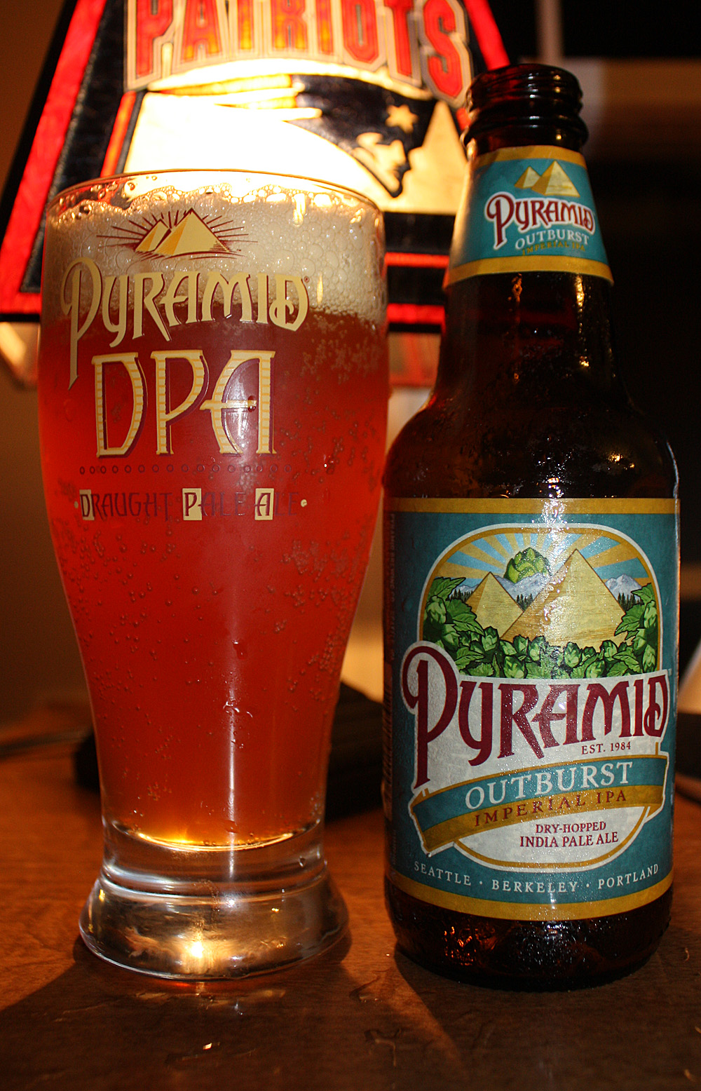 Outburst Imperial IPA is a year-round product for Pyramid. Its dry hopped and comes in at 8.5% alcohol by volume and an impressive 80 IBUs. Ingredients from the Pyramid website: