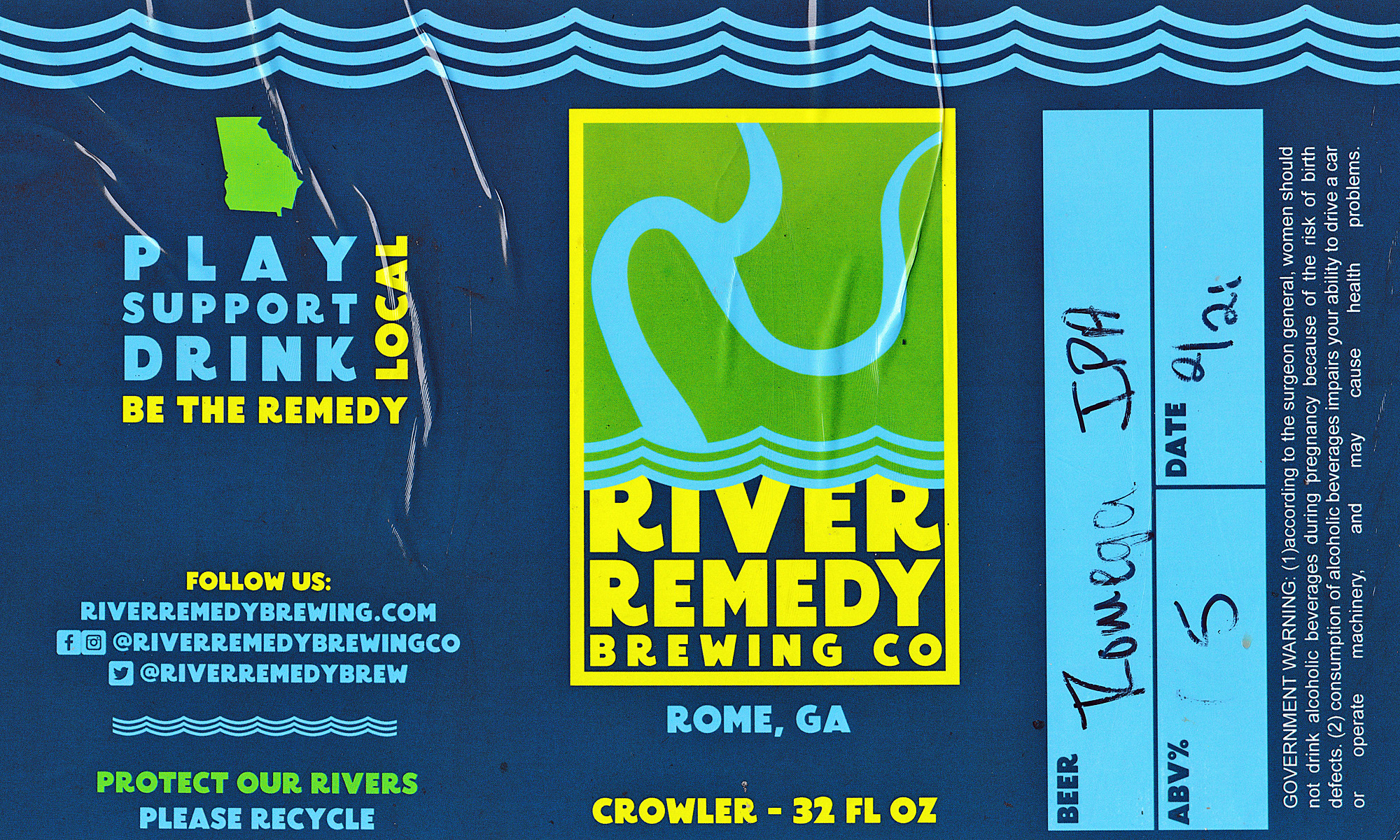 River Remedy Romega IPA has an alcohol content of 6.5% by volume and I paid $15 for a 32-ounce crowler at the brewery.