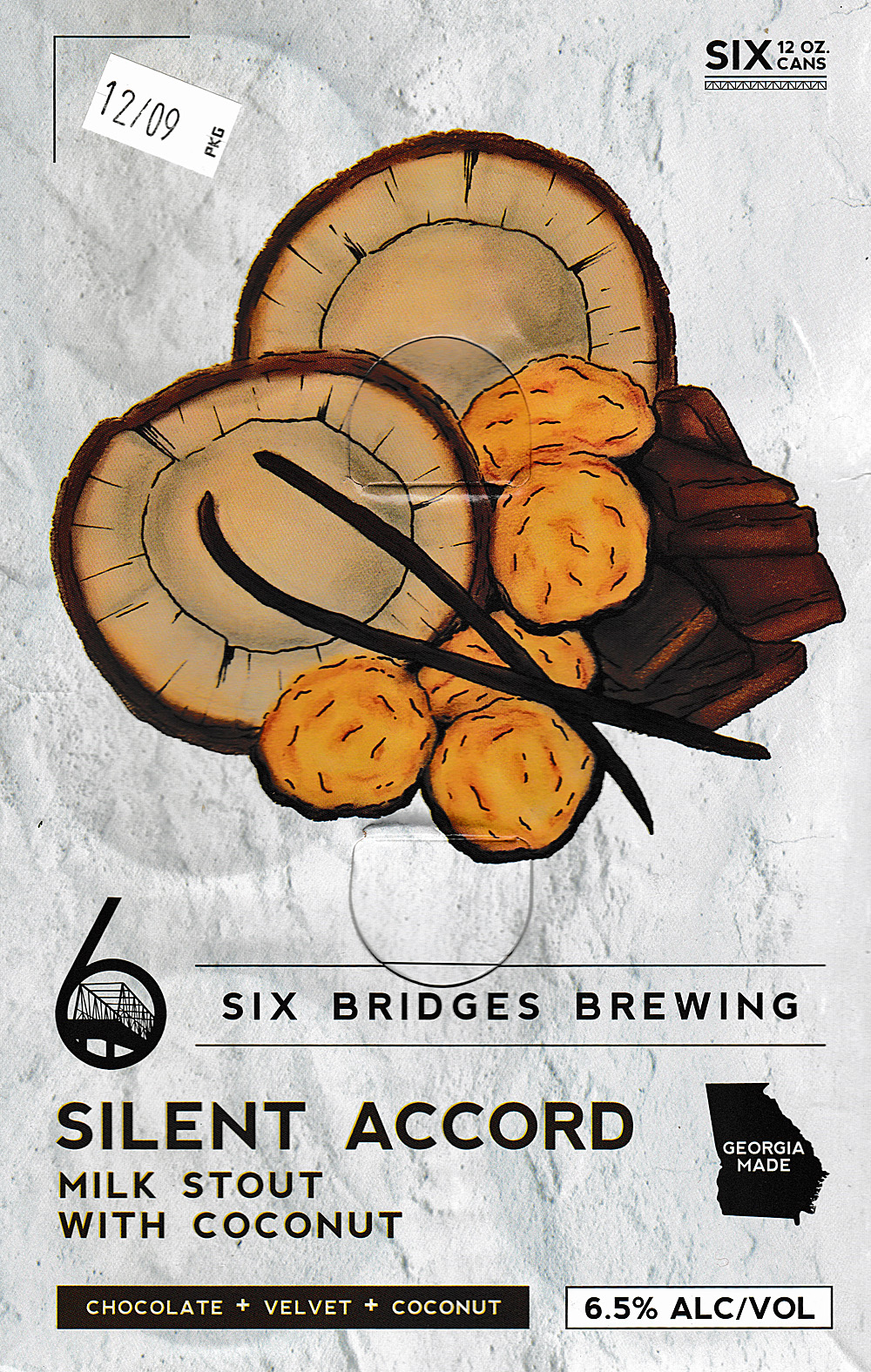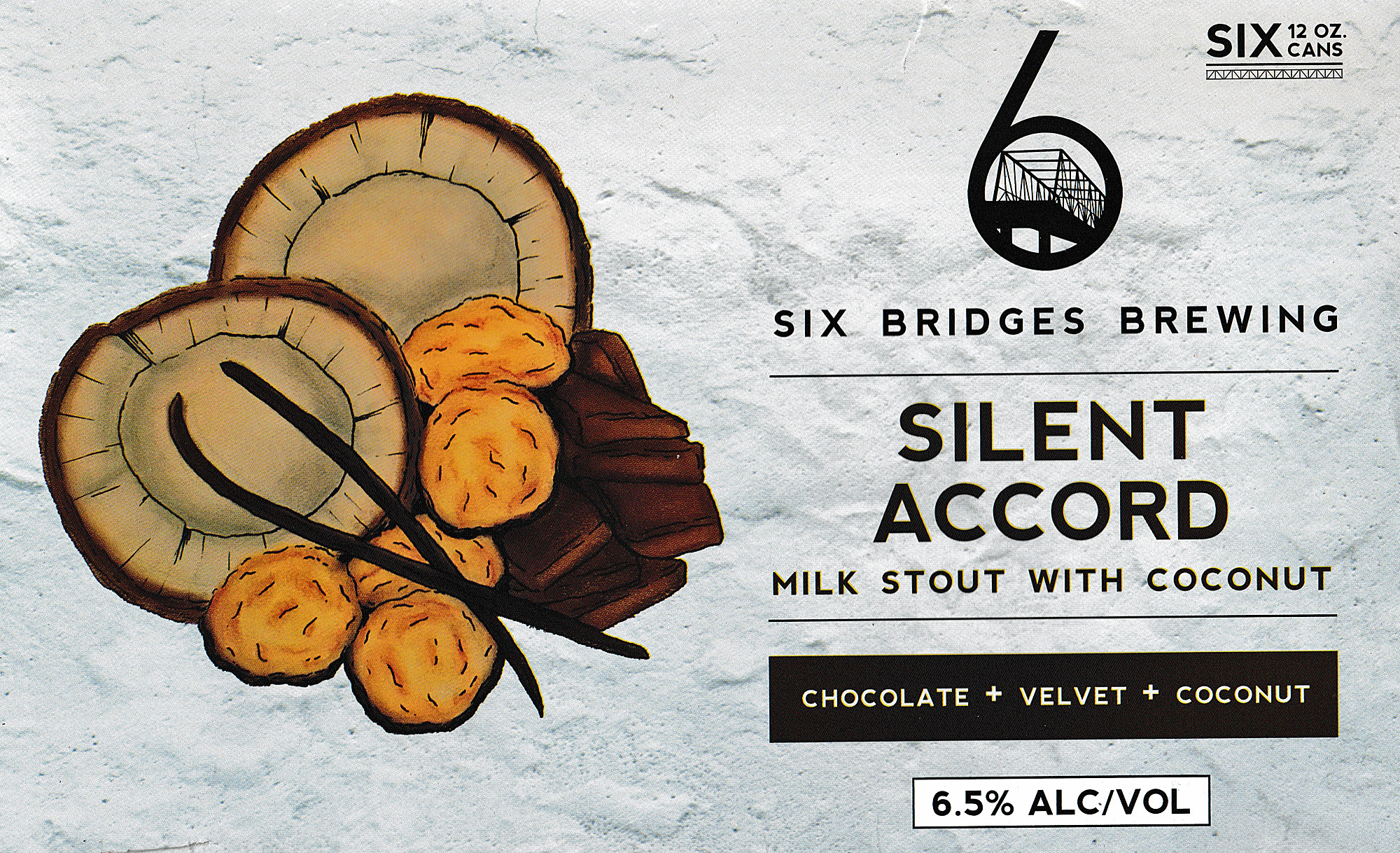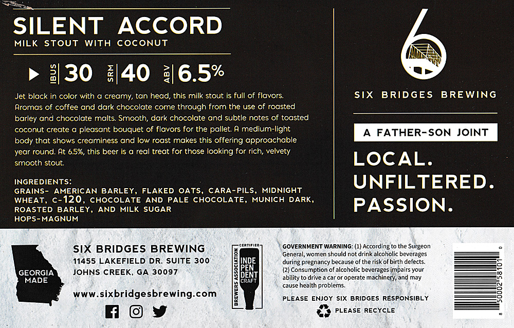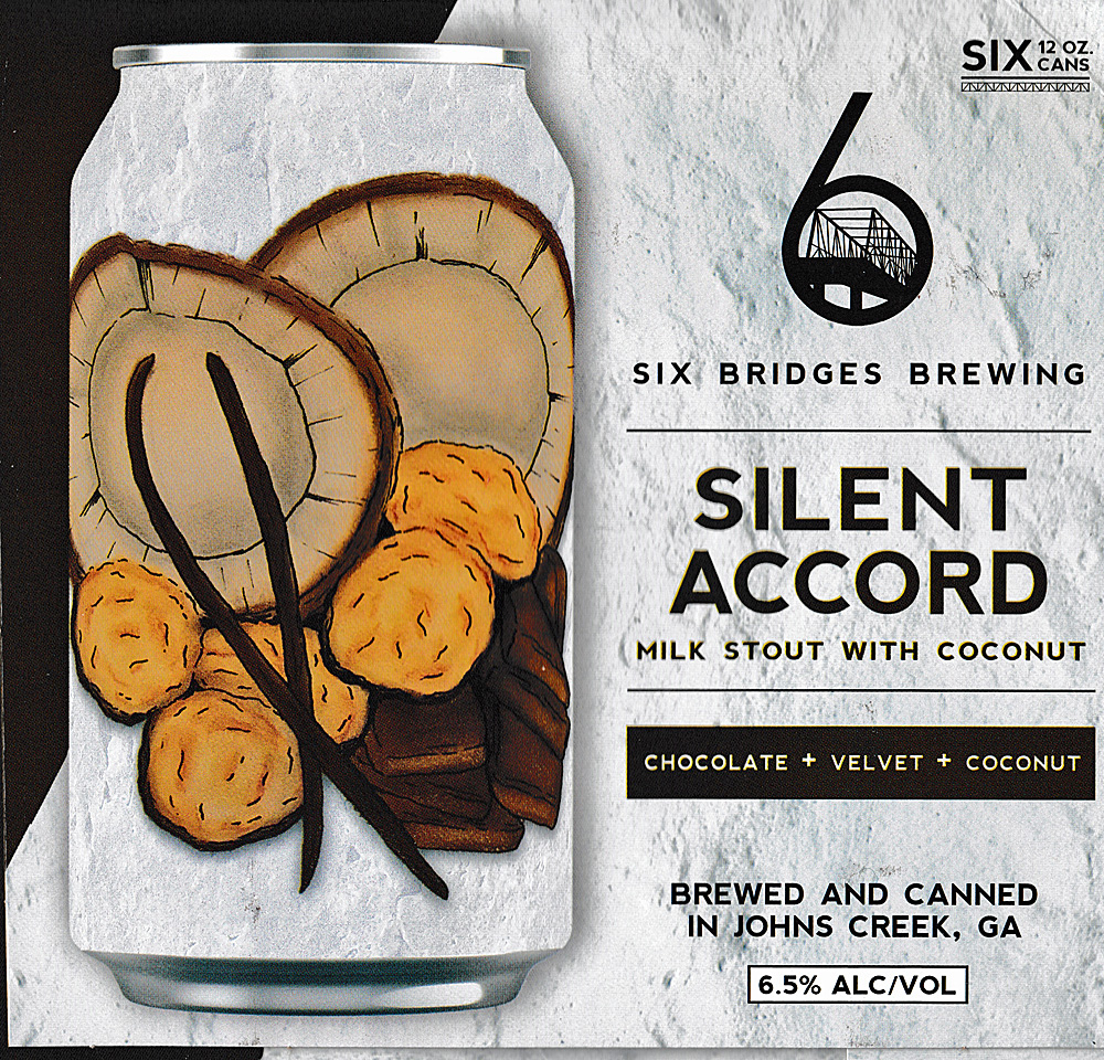 6 Bridges Silent Accord pours to a dark black (but not opaque) color with a thick creamy tan head and a nose of soft malt and toasty coconut. Taking a sip, the beer is smooth and creamy with milk chocolate and permeating toasted coconut, finish is slightly sweet. 4 stars I am enjoying it! $11.39 at Target.