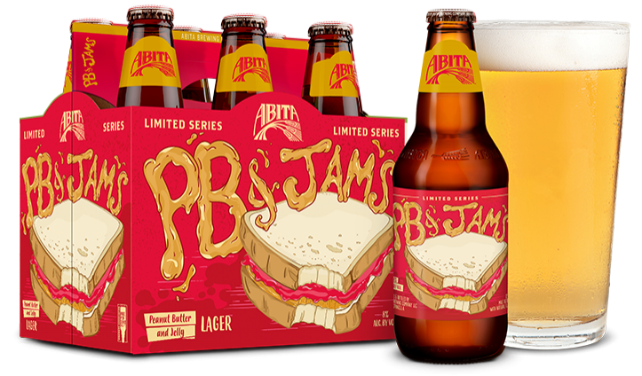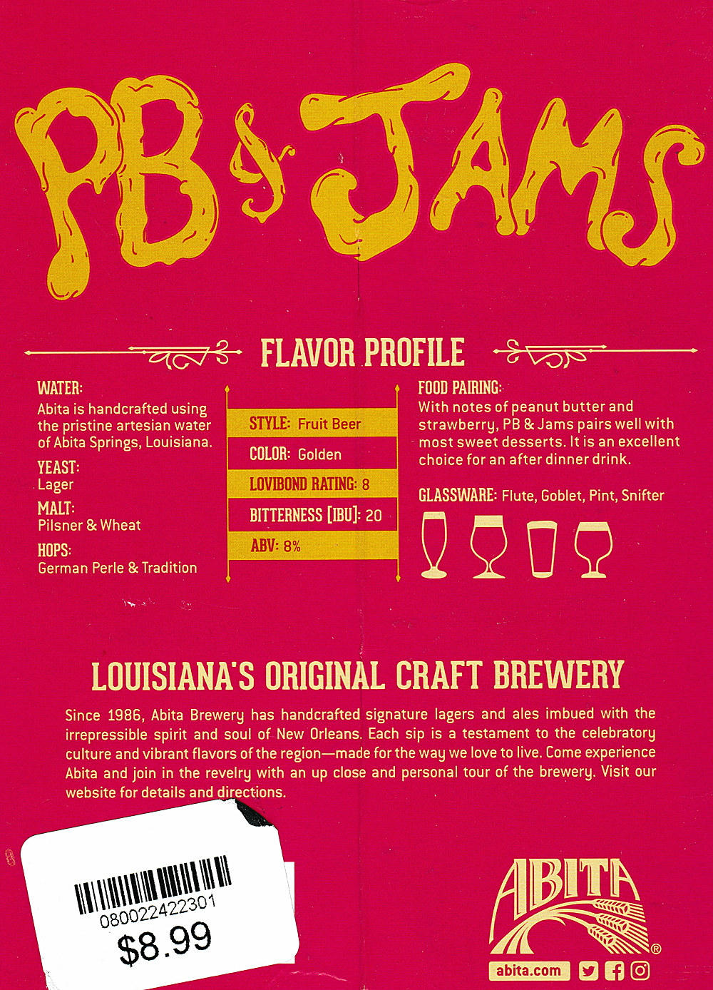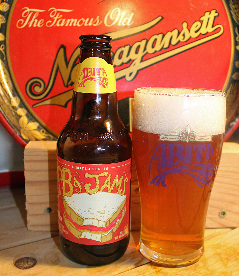 Then, though, fellow Georgia beer savant Brian the Beersnob reviewed Abita PB & Jams, and I decided I needed to get back to Target to get me some, before there was no more to get. I did this one morning, as soon as they opened, and I did get one of the last few six-packs they had. Getting it home, I checked out what Abita had to say about PB & Jams Peanut Butter & Jelly Lager: