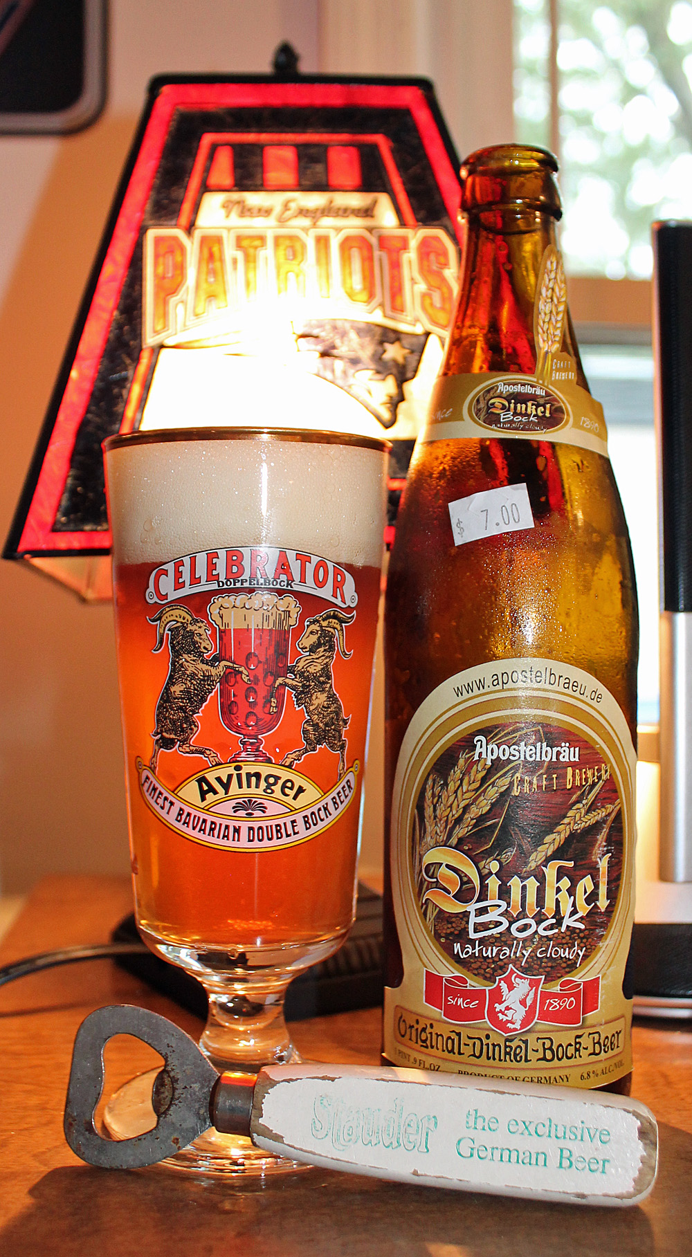 Although the above states that Apostelbrau Dinkel Bock has an alcohol content of 6.6% by volume, my bottle says it is actually 6.8%. The beer has 35 IBUs and I paid $7.00 for my half liter bottle at Bruisin Ales in Asheville, North Carolina.
