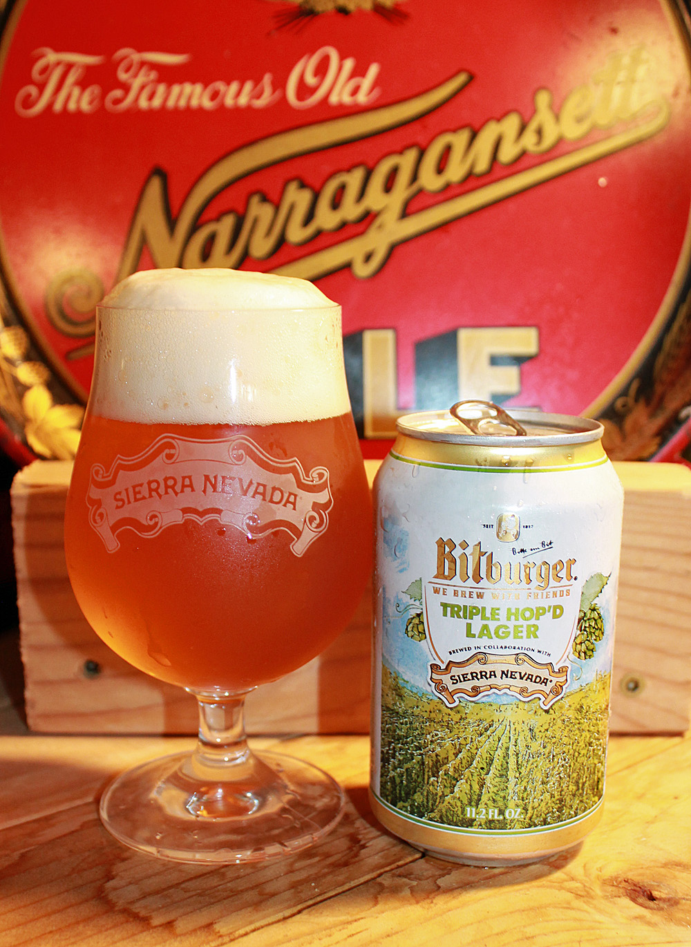 Bitburger Triple Hop’d Lager pours to a golden amber color with a thick fluffy head of foam and an herbal, slightly citrusy hop aroma. Taking a sip, the beer has a crisp biscuity malt backbone with some citrusy, gently resiny American hop notes floating through. The sharp, herbal, grassy German hops cut right through them and punctuate the beer in the rather bitter finish. Very tasty indeed!