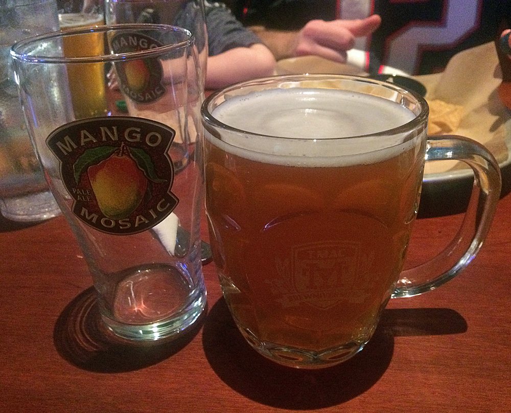 Breckenridge Mango Mosaic Pale Ale has an alcohol content of 5.5% by volume with 29 IBUs. I paid $5.75 for a 20-ounce mug with a free pint glass. It runs $10.99 a six-pack in bottles.