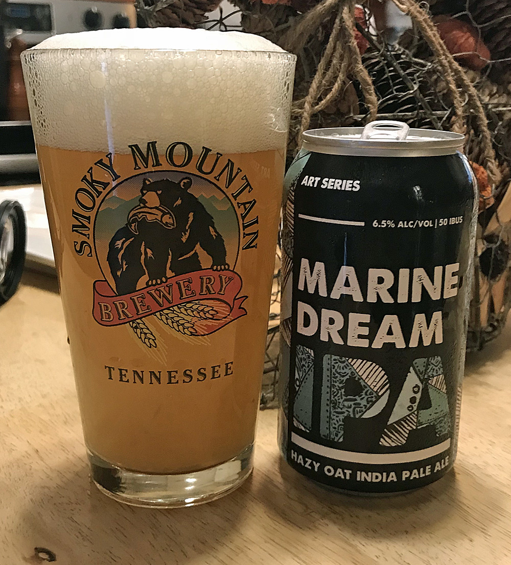 Hey there, Bruguru! What’s wrong with you??? You’re drinking that can of Coronado Brewing Marine Dream IPA from a Tennessee brewery beer glass! Have you lost your mind? I may have, in fact, dear reader. For some reason, I thought Marine Dream IPA was from a Tennessee brewery; I bought it at Wild Hare Beer Company in Spring Hill, TN, after all, and they do feature mostly local beers. Still and all, they carry beers from other states, too, so I don’t know what I was thinking. I saw a can in the singles section, and I bought it. My first choice is to drink a beer out of a glass from the same brewery as the beer; failing that, I’ll shoot for the same state or country. I should have had this one from a California glass; I didn’t. Coronado Brewing has been in business since 1996, but as far as I can tell this is the first beer I’ve ever had from them. It’s an entry in their “Art Series” of beers. They say on the can label: Marine Dream IPA is brewed with oats and London III yeast for a smooth mouthfeel and hazy, New England-style appearance. Citra, Mosaic and Vic Secret give this beer a bright, tropical profile with a lingering juicy fruitiness. Coronado Brewing Marine Dream IPA has an alcohol content of 6.5% by volume with 50 IBUs. It runs $10.99 a six-pack at Total Wine. I lost my receipt so don’t know what I paid for my single. Coronado Brewing Marine Dream IPA pours to a very cloudy orange color with a thick rocky head and a vibrant juicy citrus and tropical fruit nose. A thick layer of Brussels lace forms on the sides of my glass, descending with the liquid all the way to the bottom. Taking a sip, the beer bursts with orange and grapefruit juice notes, pineapple, and passion fruit. It’s smooth and silky on the palate and finishes slightly bitter with herbal minty notes. Coronado Brewing Marine Dream IPA is juicy from head to toe, and though I’d like a little more malt it’s not thin in body. One of the better examples of this style I’ve had lately, I hope to see it in Georgia. I’d love more of this wonderful beer.