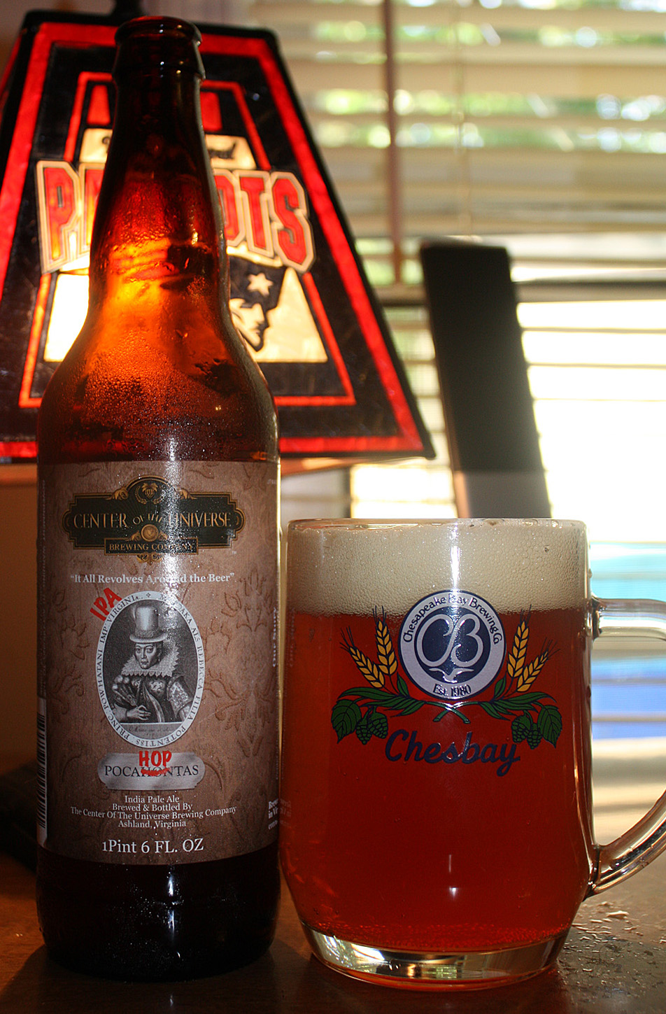 It’s official. Ashland, Virginia is the Center of the Universe. At least, that’s what the fine folks at that city’s Center of the Universe (COTU for short) Brewing Company tell us. And who am I to argue with them? They do further add that “It all revolves around the beer”, and I can certainly see that. What’s more, they certainly deserve credit for originality by naming their IPA as they have: Pocahoptas. Pocahontas, of course, was a Virginia native, and though by marrying an Englishman she almost certainly tasted beer at some point, it was definitely not an IPA.