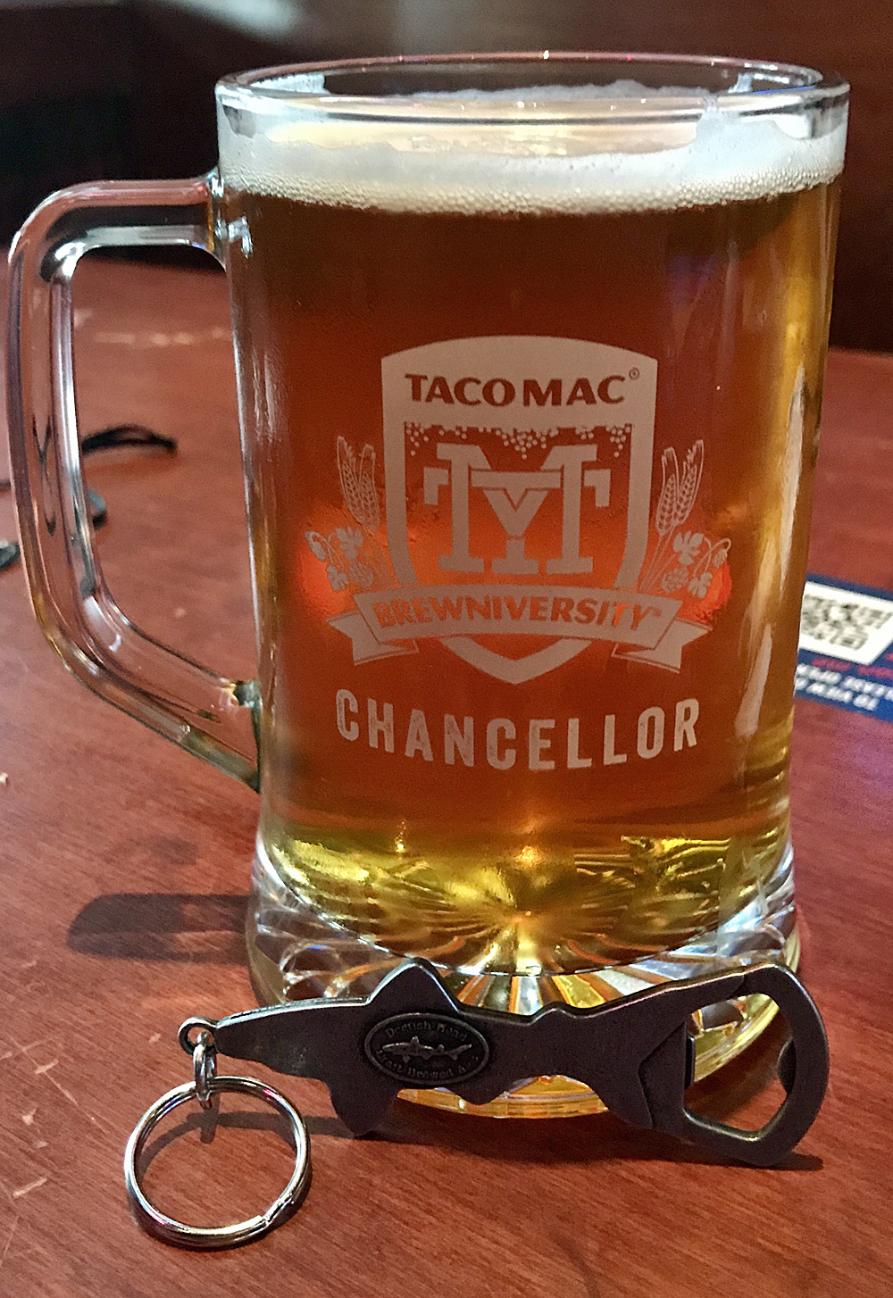 Dogfish Head 60 Minute IPA has an alcohol content of 6% by volume with (of course) 60 IBUs. I paid $7.50 for a 23-ounce mug at Taco Mac, and you can get it for as little as $9.49 a six-pack at Target. Since Dogfish Head beers are featured as Beers of the Month for June of 2021, my mug came with a free keychain opener.
