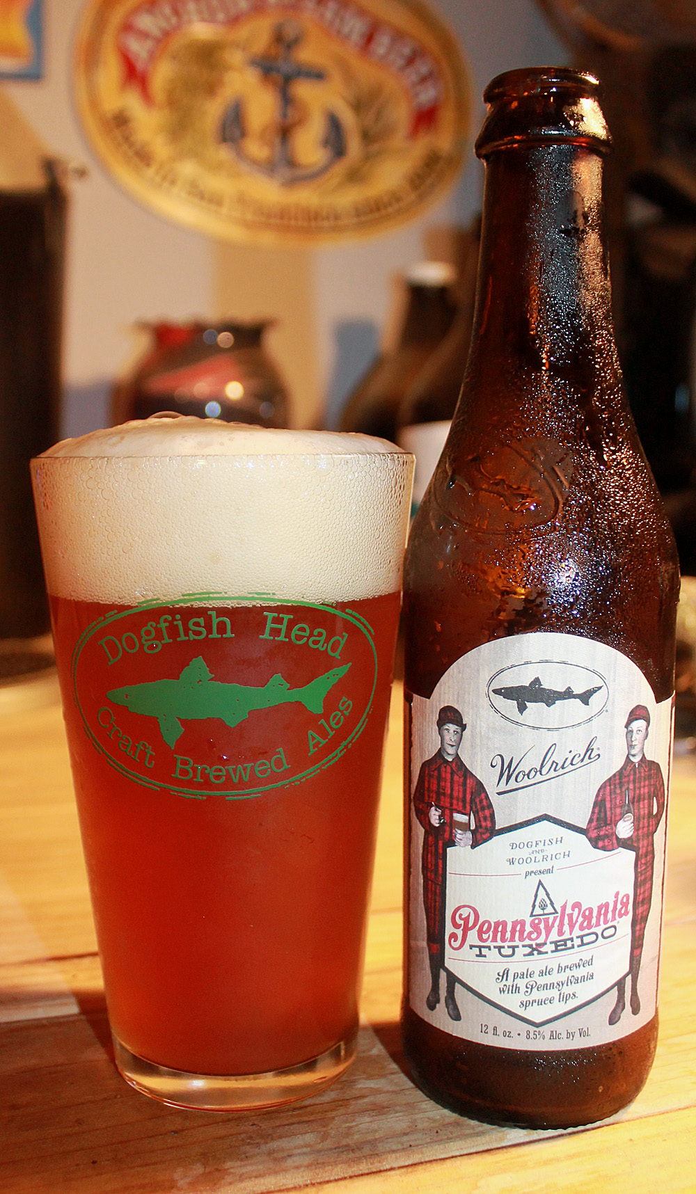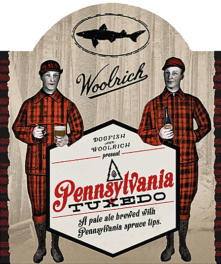 I’ve seen a lot of collaboration beers in my day. For the very few of you out there that don’t know what that is, a collaboration beer is generally a partnership between two (or more) craft brewers where they team up to brew. Unheard of before the advent of small breweries in America, such efforts are generally, again, a joint effort between brewers. Leave it to Milton, Delaware’s Dogfish Head brewery and Woolrich, a…clothing company???...to bring us a different kind of togetherness: Dogfish Head Pennsylvania Tuxedo, a pale ale brewed with Pennsylvania spruce tips.