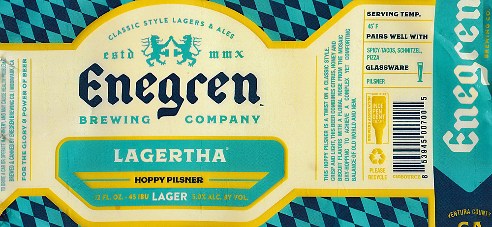Do you watch Vikings? I sure do. The show is based on legendary characters from old Norse sagas, and Lagertha is prominently featured in them, as she is in the History Channel TV show. Now, though, Lagertha is also a beer, made by the Enegren Brewing Company of Moorpark, California. And of course, don’t you know. Lagertha the beer is, ummm, a lager-tha. Ba dum dum. The full name of the beer is Enegren Lagertha Hoppy Pilsner, but this is not your average hoppy pilsner. It is a hoppy pilsner, just not in the way I thought it would be hoppy. Enegren explains why on their website: Lagertha is our take on a classic Czech-style Pilsner. Brewed with traditional European ingredients plus American Mosaic Hops, this is a hoppy twist on a classic style. The beer is crisp, light and complex with hop-forward citrus and fruity flavors with hints of honey and biscuit. This clean, crisp and refreshing beer is one of our favorites! Ingredients, also from the website: MALT: German Pilsner, Melanoidin Malt HOPS: Saaz, Mosaic It’s the addition of Mosaic hops here that makes all the difference. Enegren Lagertha Hoppy Pilsner has an alcohol content of 5% by volume with 45 IBUs. I paid $4.49 for my 12-ounce can at Craftshack.com, and Total Wine sells it for $9.99 a six-pack. Just not in Georgia. The price seems reasonable enough. Enegren Lagertha Hoppy Pilsner pours to a brilliant straw color with a thick creamy white head and an alluring nose of herbal hops, pineapple and citrus notes. Taking a sip, the beer is crisp malty with toasty honey notes, mango and papaya, lemon zest and earthy herbal notes and at the last a drying bitterness. Not your average pilsner to be sure, but they freely admit this. To my taste, the Mosaics definitely overpower the Saaz, and the beer ends up more like an India Pale Lager or even an IPA than a pilsner. Still and all, I enjoyed it, and would drink it again. And remember, try a new beer today, and drink outside the box. *Pricing data accurate at time of review or latest update. For reference only, based on actual price paid by reviewer. (B)=Bottled, Canned (D)=Draft