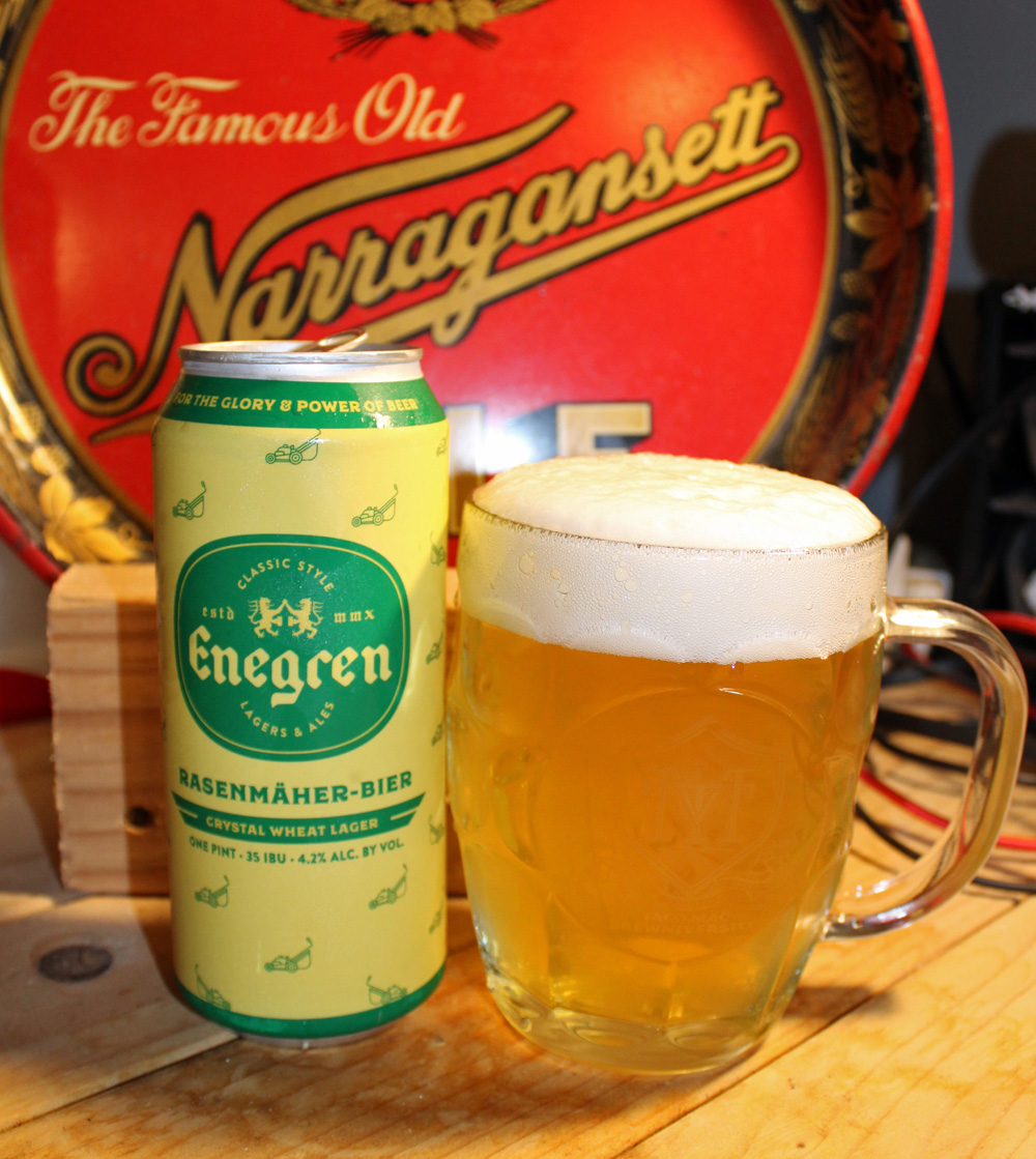 Welcome, friends, to my review of a rare and special style of beer! I’m here to tell you about Rasenmäher-Bier, a German style brew know t5o few, and drunk by fewer. It’s so secret, in fact, that…., wait. Stop. I can’t go on with this. It wouldn’t be fair. It wouldn’t be right. Rasenmäher is NOT a style of beer. It is rather the German word for lawnmower. OK, so now that you know what Rasenmäher is and what it isn’t, you can take solace in the fact that it is a wheat lager, which is kind of a rare thing actually. To be sure, it is not new. If you watch the classic Beer Hunter episode California Pilgrimage, pay attention when the Anchor gang pulls up to the Hopland Brewery. The gal behind the bar lists the beers they have on tap, and one of them is a wheat lager. Enegren calls Rasenmäher-Bier a “crystal wheat lager”. They also say on the label: We brewed this refreshing wheat based lager to honor and accompany one iof the most glorious of household chores; mowing the lawn. Hopped with a blend of Mandarina Bavaria Tettnager hops for earthy and fruit flavors and filtered clear fro crispness, this beer may even have you pulling some weeds too. Enegren Rasenmäher-Bier has an alcohol content of 4.2% by volume with 35 IBUs. I paid $3.99 for my can from Craftshack, but I cannot find a price for it in four or six packs. Stylewise, I would peg this as an American Lager, albeit a somewhat idiosyncratic one. Your mileage may vary. Enegren Rasenmäher-Bier pours to a lightly cloudy golden color with a thick fluffy white head and a citrusy lemony nose. Taking a sip, the beer is light and crisp, crackery wheaty with a touch of bready malt. It is lemony citric and finishes dry with herbal earthy hops and a sharp bitterness. Very refreshing and very good! Judged as an American Lager, it's a darned fine one. I am more and more impressed with every beer I try from Enegren. They are fast becoming one of my favorite breweries, such a shame they do not sell their beers in Georgia. Thankfully, there is Craftshack. As it happens, I just placed another order this morning. You’ll excuse me while I go wait for the FedEx truck. And remember, try a new beer today, and drink outside the box. *Pricing data accurate at time of review or latest update. For reference only, based on actual price paid by reviewer. (B)=Bottled, Canned (D)=Draft