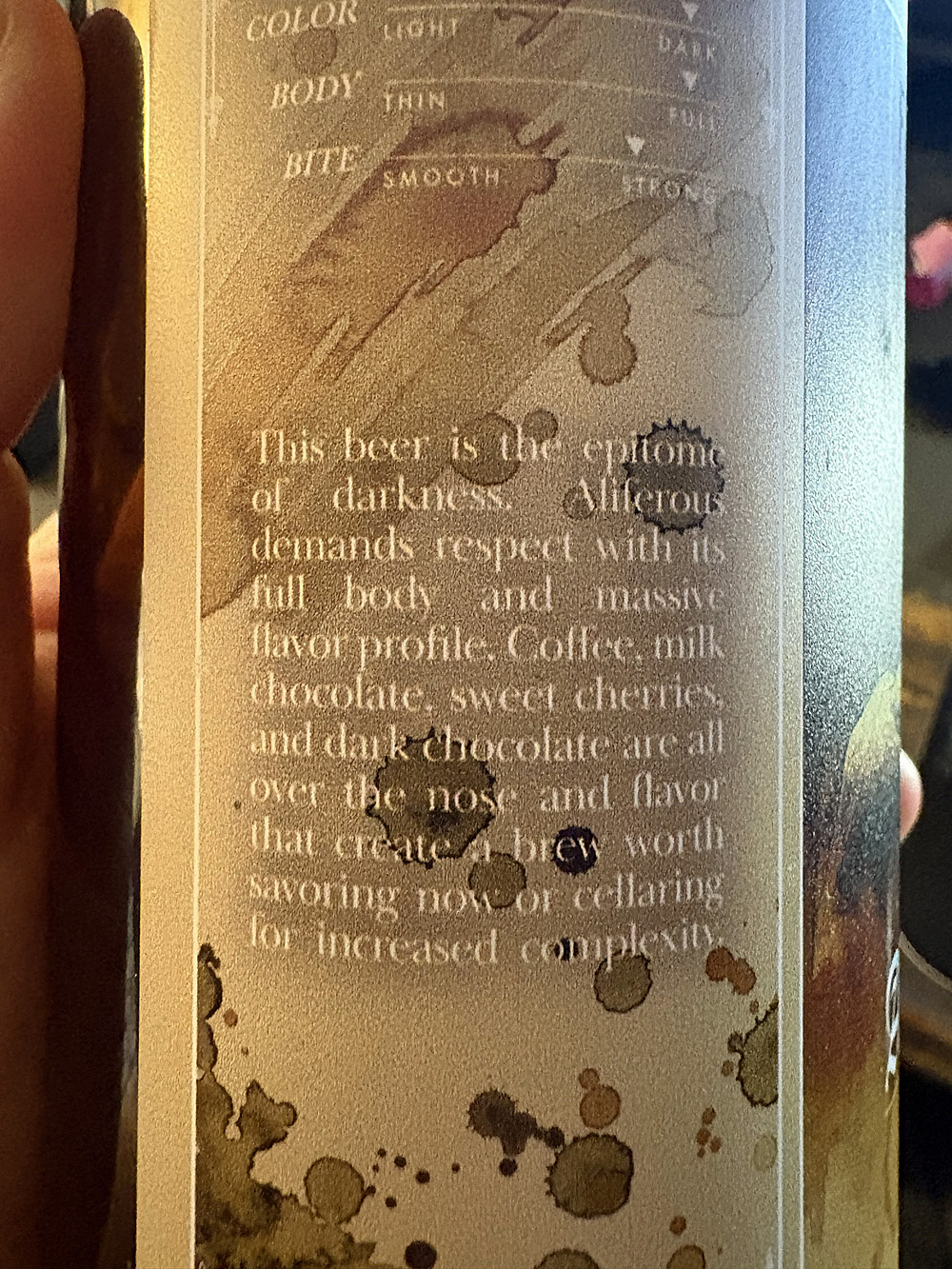 Anyway, my bottle of Fire Maker Aliferous Imperial Stout was brewed in 2022, so it already had a little bit of age on it when I bought it. Then I read this on the label: