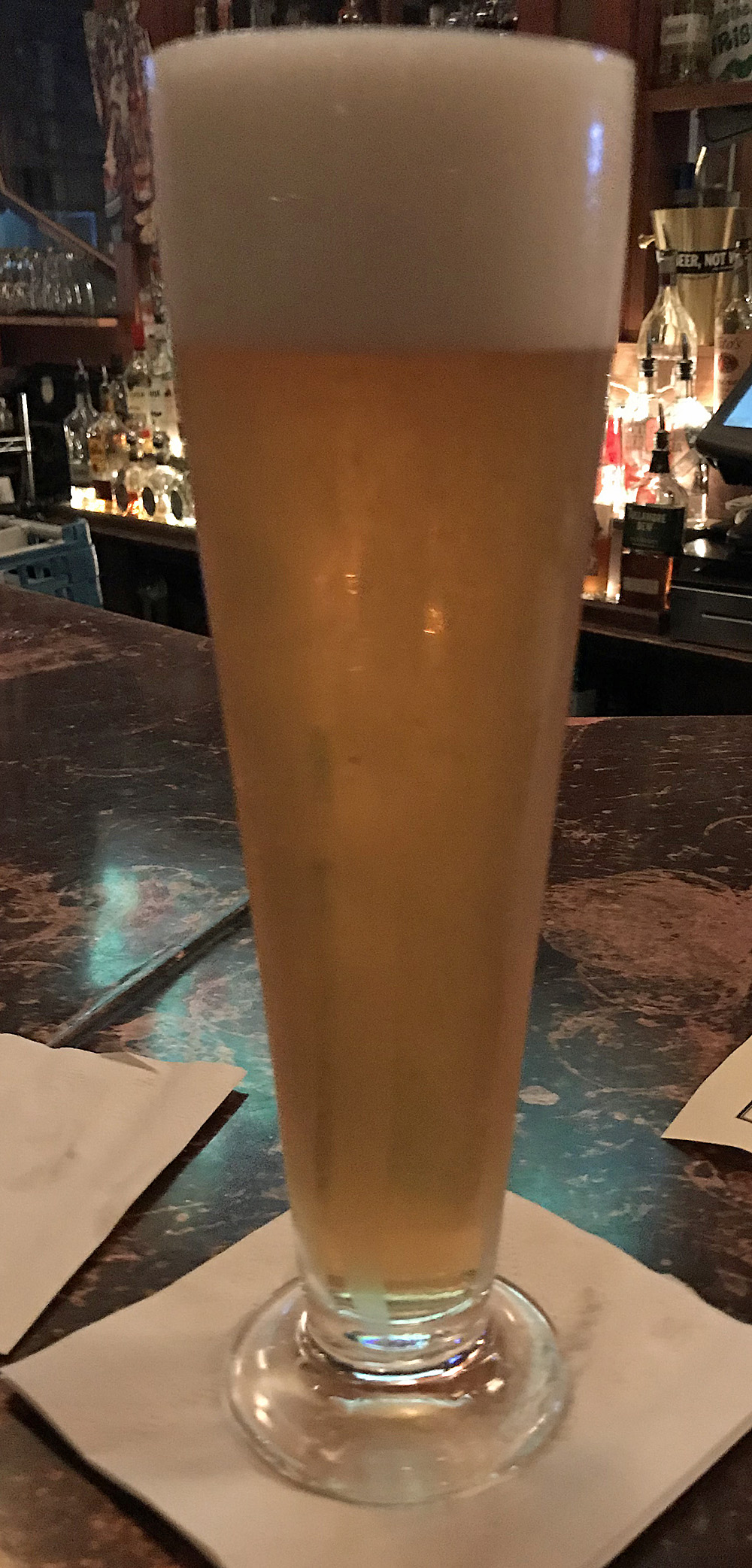 After sampling all those heavy imperial stouts (many of them barrel aged), I wanted something that could cut through the remnants of roast and licorice in my mind’s palate. Something not heavy on alcohol, either, as this was the nightcap. Five Seasons to the rescue with Take It Easy Berliner Weisse.