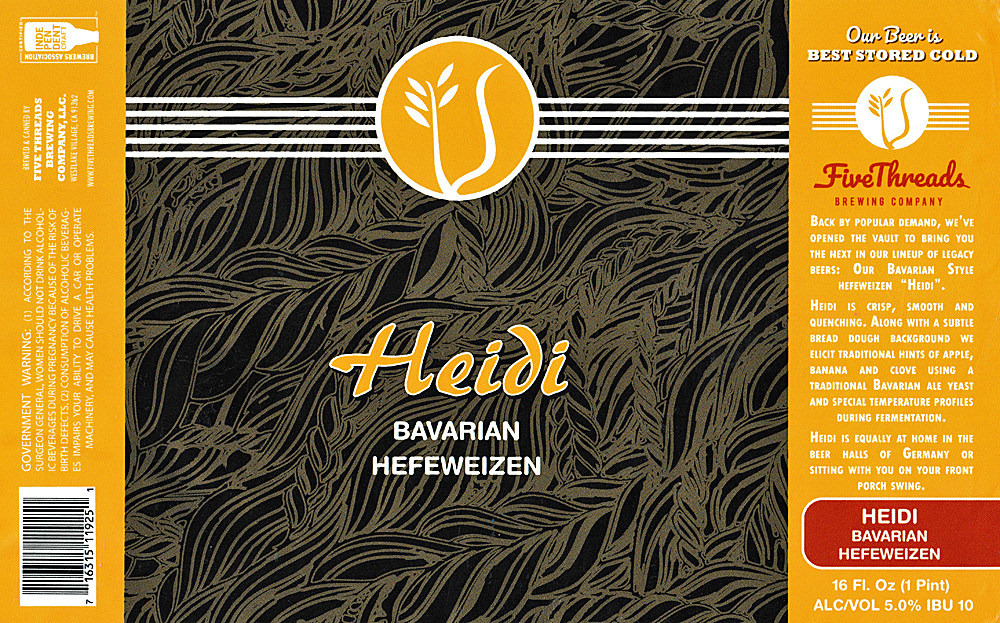 Ok now, you are asking yourself at this point, Bruguru, you guru of brew you, what in the actual hell does any of this have to do with Heidi Bavarian Hefeweizen from California’s Five Threads Brewing? Well you see, I drank my can of Heidi right after my can of Feierabend, so when I went back to September of 2021 to get my photo of Feierabend off my OneDrive, I saw photos of Heidi-and realized I had not reviewed that either. So here we are and, as I told you, the way I review beers can be very strange, indeed.