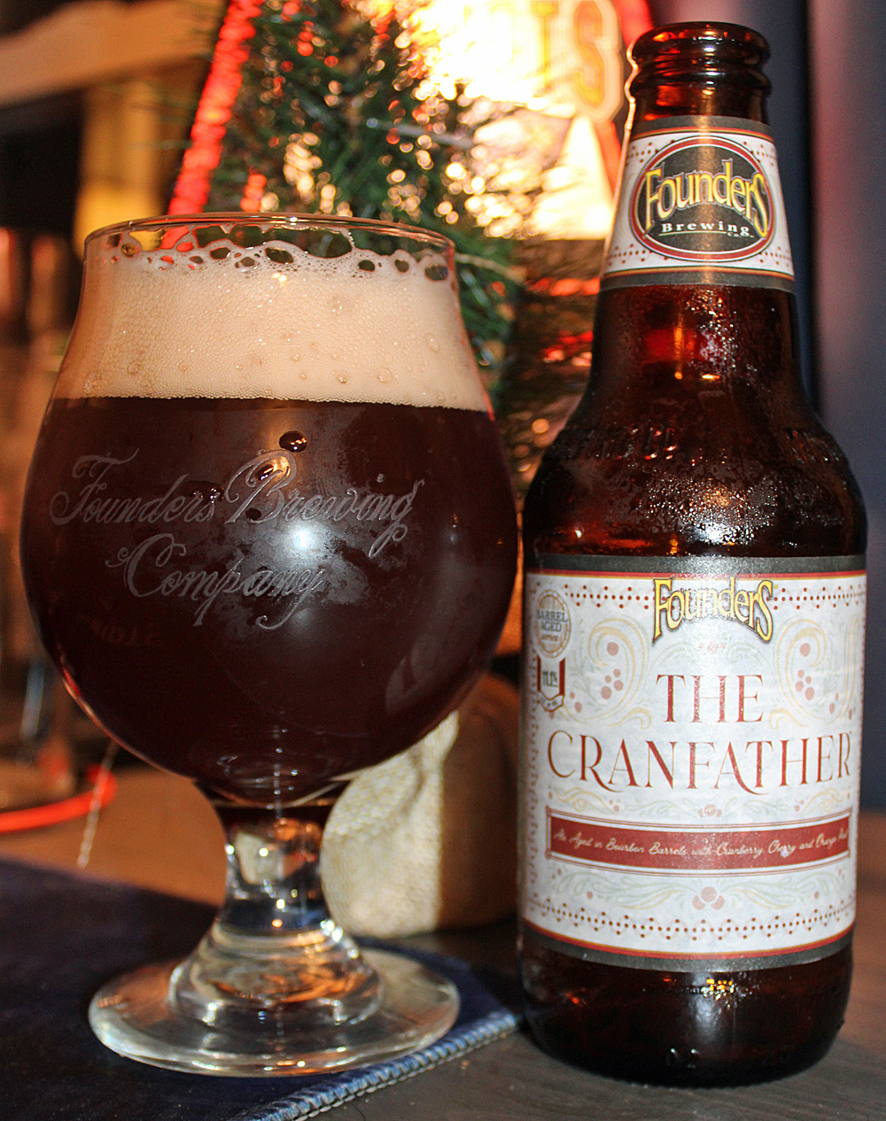 Founders The Cranfather Ale Aged in Bourbon Barrels with Cranberry, Cherry, and Orange Peel pours to a bright pinkish ruby color with a light head and a nose of bright bourbon soaked orange and cranberry fruit. Taking a sip, the beer is medium and body and again very fruity; I get the citrusy orange up front. Then the cranberries come through, very tart but also adding a slightly creamy note. I didn’t get the cherry so much, but the boozy bourbon comes in at the last and complements the warming alcohol nicely.