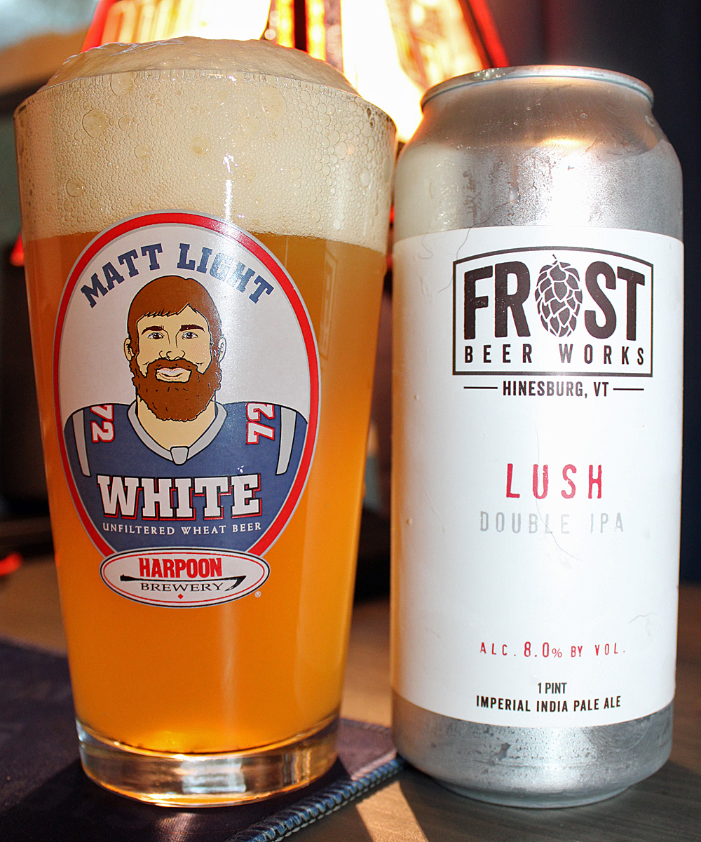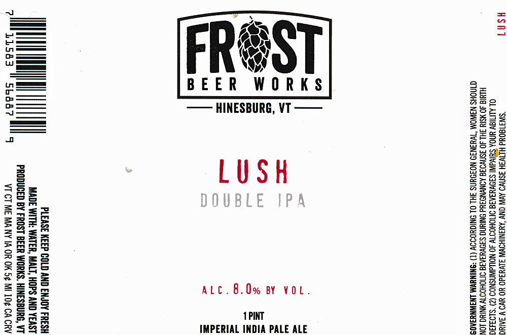 Well here’s another fine beer from Frost Beer Works of Hinesburg, Vermont: Lush Double IPA. This is not the first beer I have had from Frost, though it is the first one I am reviewing. I have tasting notes on Frost Coffee Porter and Frost heavy Imperial Stout I need to flesh out into reviews. Eventually, I will.