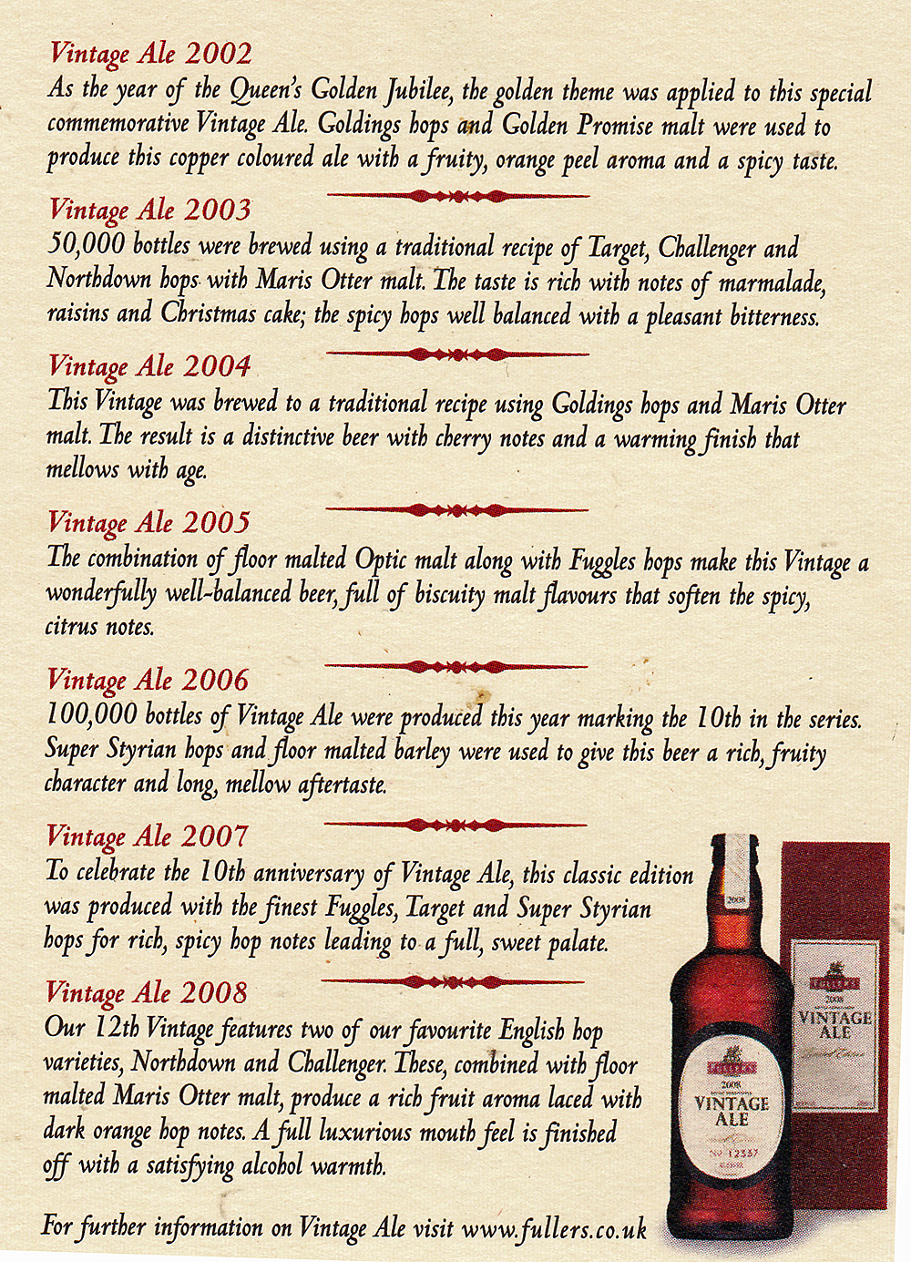 I found it quite curious that the label on my bottle stated this beer was “Best Before End 2012”. Being a potent brew under bottle-conditioning, it surely would last much longer than 3 years, and indeed why would Fuller’s sell this in a 4-pack vintage series past any best by date? The label of the beer solves this mystery.