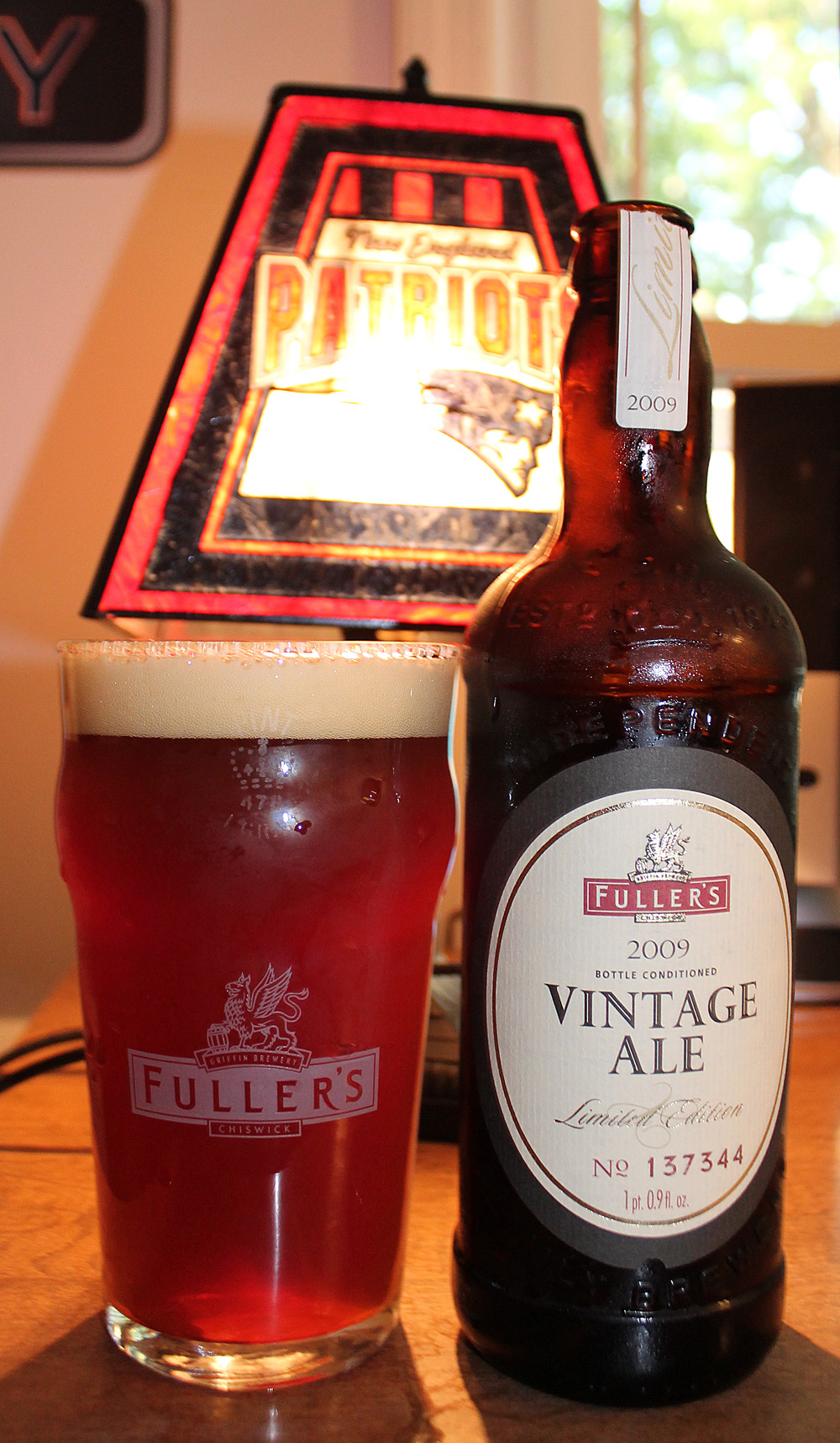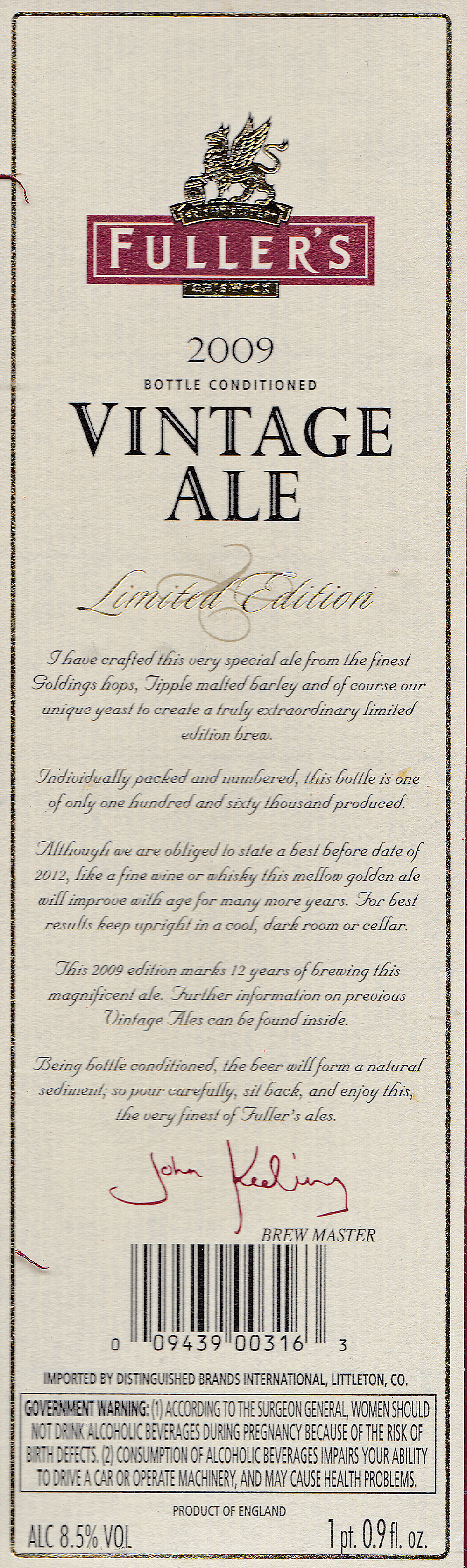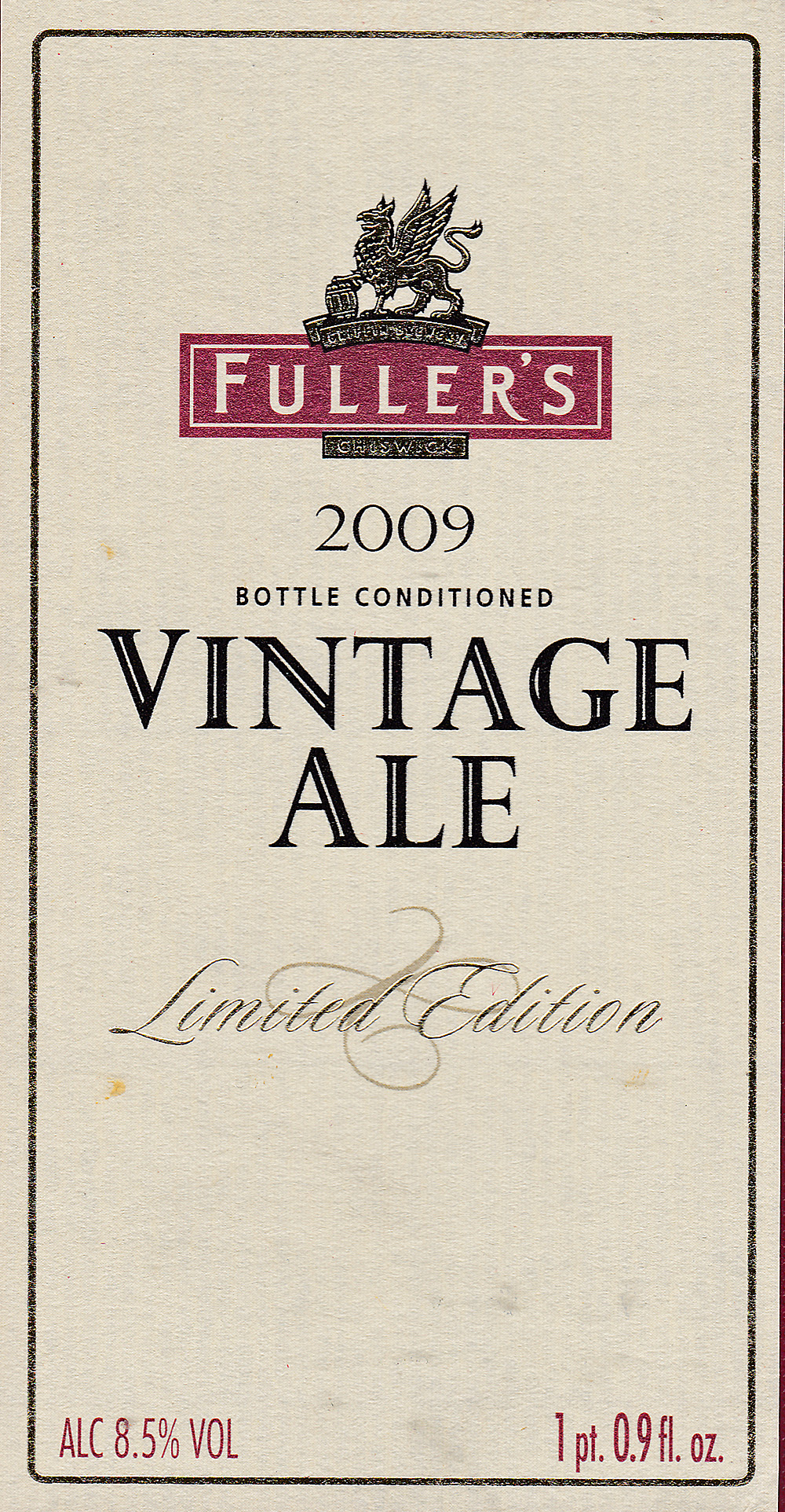 Fuller’s Vintage Ale 2009 Edition has an alcohol content of 8.5% by volume. The 4-pack ran $29.95 at Greene’s, a real bargain and at about $7.49 per bottle and not much more than the $6.95 I paid for the 1998 edition 17 years ago. This is the 13th annual bottling of Fuller’s Vintage Ale, though no bad luck here folks. There’s something a little different about each vintage, too.
