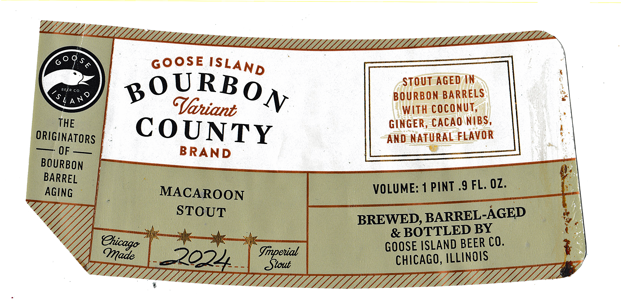 2024 Bourbon County Brand Macaroon Stout is an imperial stout aged for a full year in bourbon barrels before adding rich cocoa nibs, sweet candied ginger and toasted coconut. This decadent stout is an homage to the flavors of homemade coconut macaroons with a twist of nostalgia.