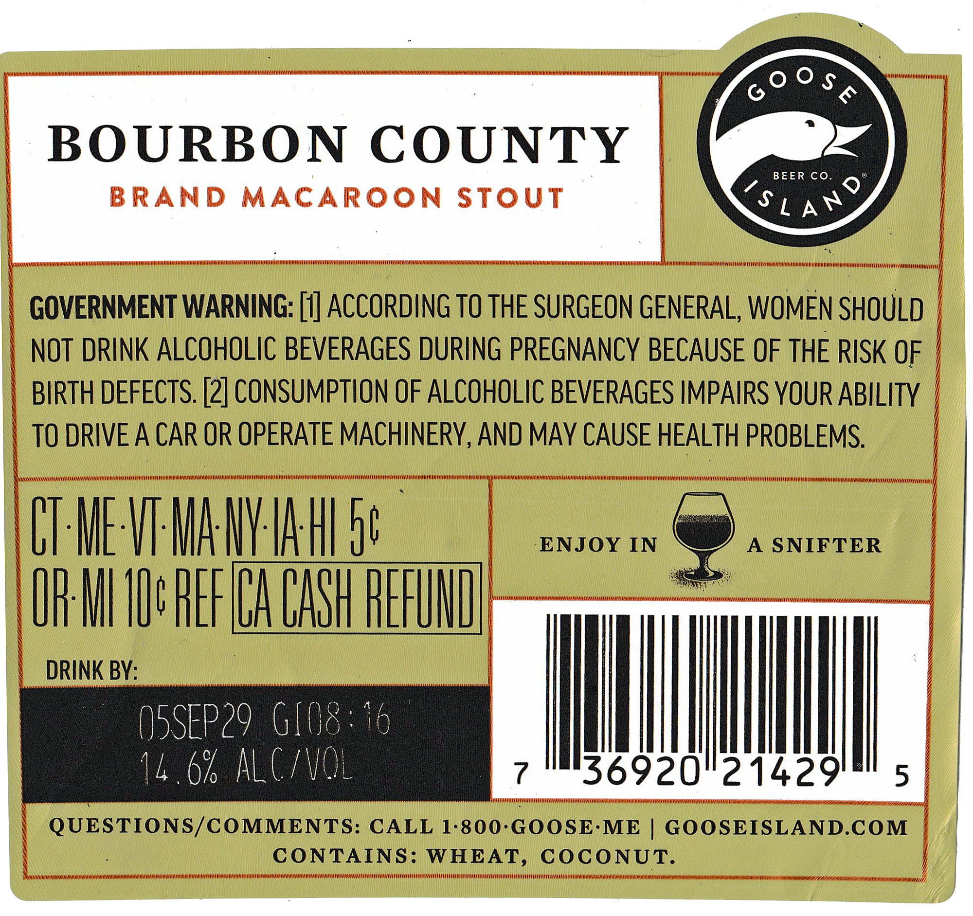 Goose Island Bourbon County Brand Macaroon Stout has an alcohol content of 14.6% by volume and I paid $27.99 for my half liter bottle from Half Time. Total Wine claims they have it in stock as I type at their Tallahassee, Florida store for $24.99 a bottle. My bottle says I should drink it by 05SEP29, which I obviously did.
