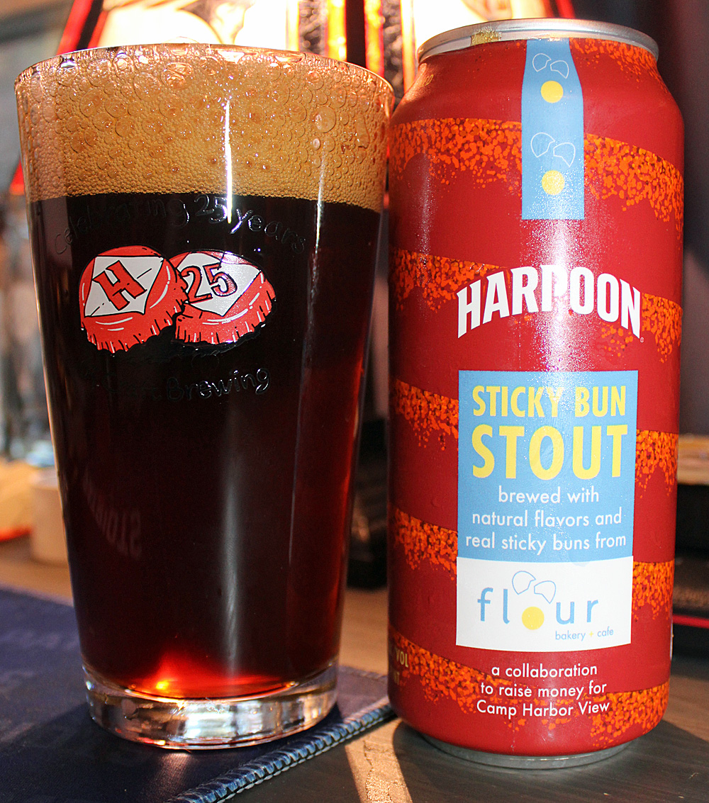 Harpoon Sticky Bun Stout pours to a dark brownish to black color (not opaque, light comes through when held to the light) with a moderate head of large bubbles and a nose of light roast and cinnamon. Taking a sip, though, damned if it does not taste like a cinnamon roll/sticky bun/coffee roll. The malt is not overly roasty and provides the doughy bun, the cinnamon laced through the beer is just like it is in the pastry, and a hint of pecan adds a toasty nuttiness. Sweet vanilla presents the sticky icing, too, and the beer finishes balanced but not overly roasty.
