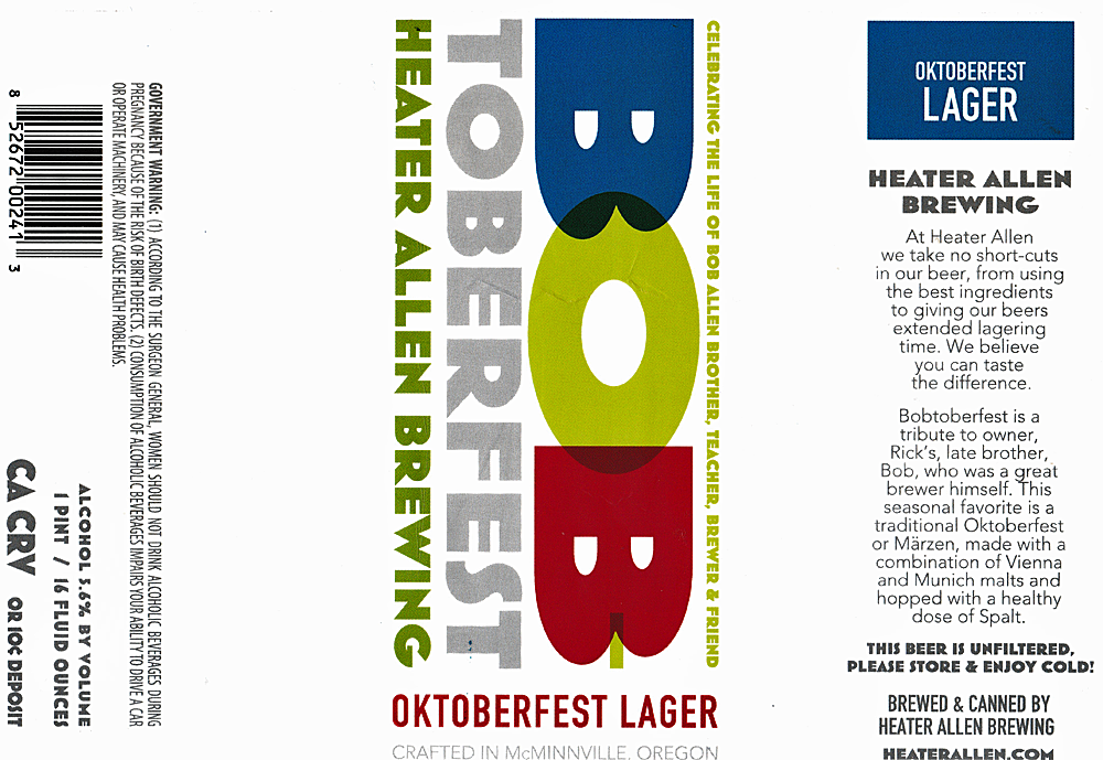 There are three breweries on the west coast that I am following with much enthusiasm: Enegren, of Moorpark, California; Occidental, of Portland, Oregon; and Heater Allen, of McMinnville, Oregon. As you may well know, I simply adore German and German style beer, and each of these brewers specializes in just that: German style beer. As I type, it’s late September, the time for Oktoberfest beer! I’ve enjoyed a malty Märzen and a bready Festbier from Enegren, and tonight I’m here to tell you about my latest Oktoberfest score: Heater Allen Bobtoberfest Oktoberfest Lager.
