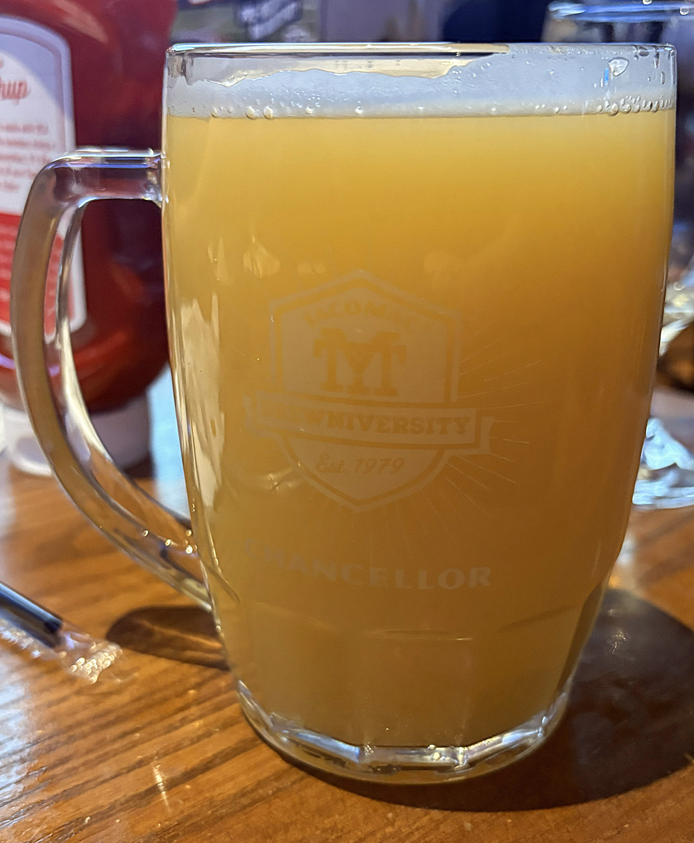 Hop Butcher for the World is located in Chicago, and I have heard good things about them for a while but have never seen their beer until now. Their Twilight to Starlight Double India Pale Ale is brewed with Motueka, Ella, and Simcoe hops, and tropical fruit medley tea. According to their website was last canned on November 13, 2025, so I will assume that is when mine was kegged as well. What’s a keg if not a really big can, after all? They call this beer a Madame ZuZu’s/Smashing Pumpkins Collaboration.