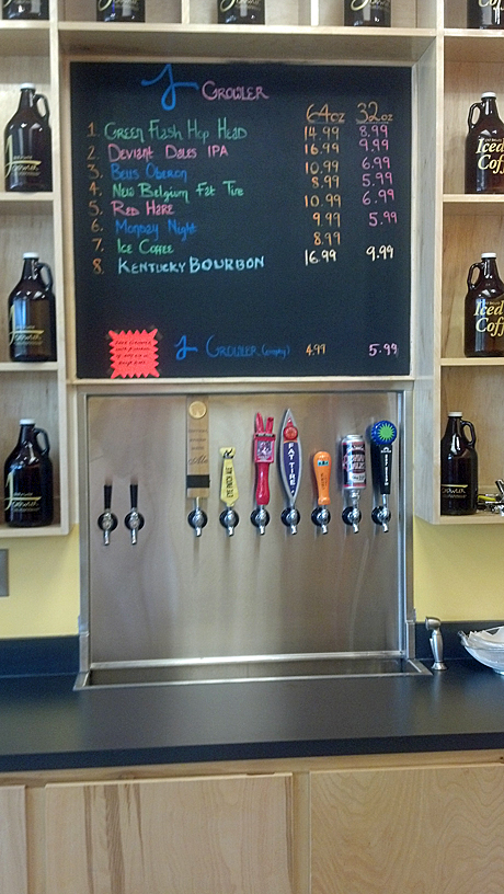 Not at all. Going inside, I noticed a wall of about 7 active taps boxed in on either side by a wall of growler bottles. Now, I knew that growlers had come to Georgia and small growler shops were popping up all over the place. But in a gas station? This sure gives new meaning to the term "Fill 'er up." Somewhere, up in beer heaven, the Beer Hunter Michael Jackson was certainly smiling.
