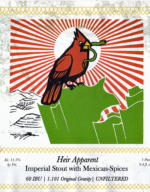 Heir Apparent is an Imperial Stout with a complex caramel soul tempered by chocolate and roasty undertones. Sweeter than our Russian Imperial Stouts at only 60 IBUs but balanced by the heat of fresh Mexican peppers, Vanilla, Cinnamon and Cocoa Nibs. The Heir Apparent is ambitiously biding his time until he comes to power. His time will come.
