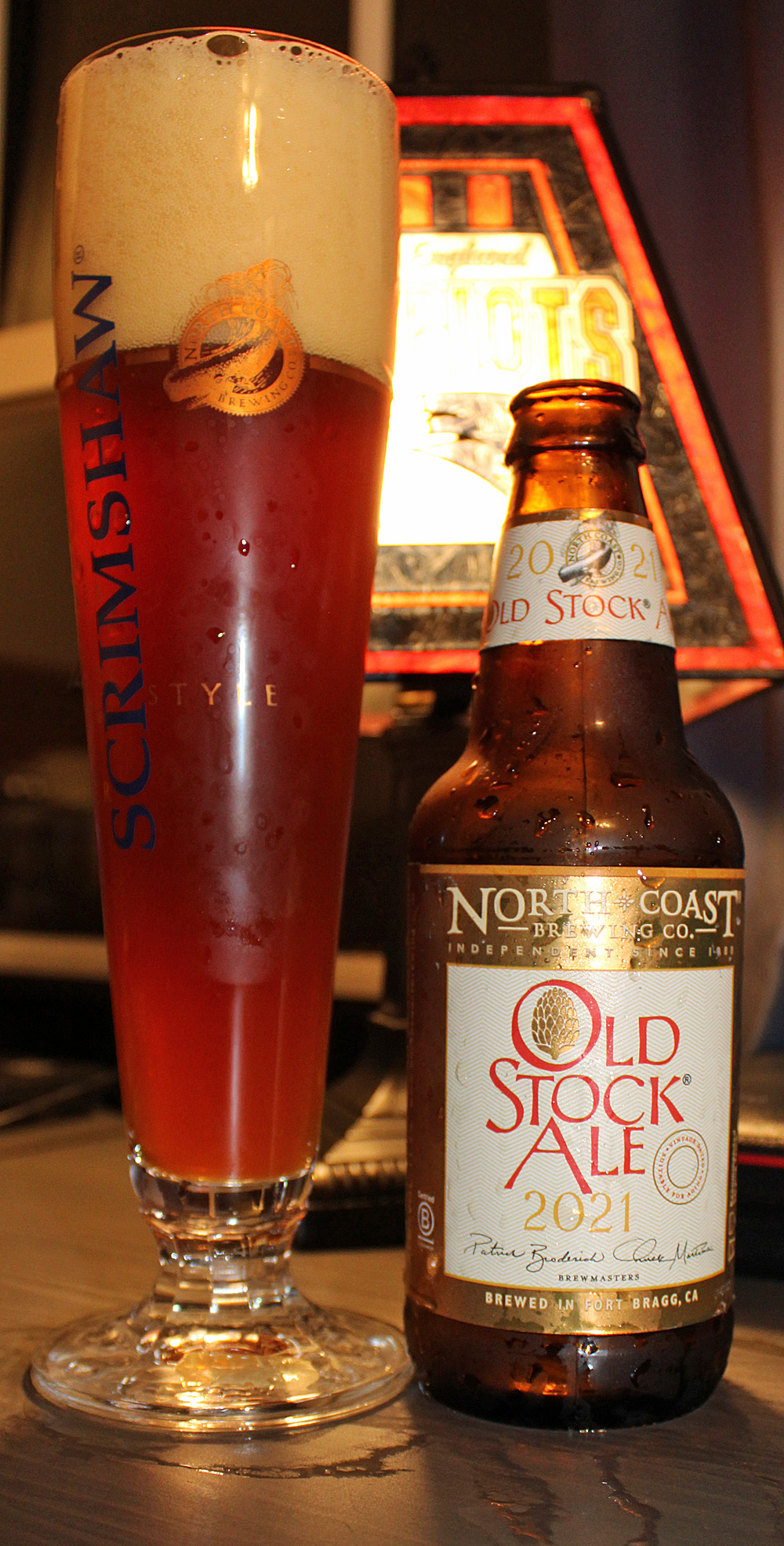 North Coast Old Stock Ale pours to a brilliant ruby red color with a