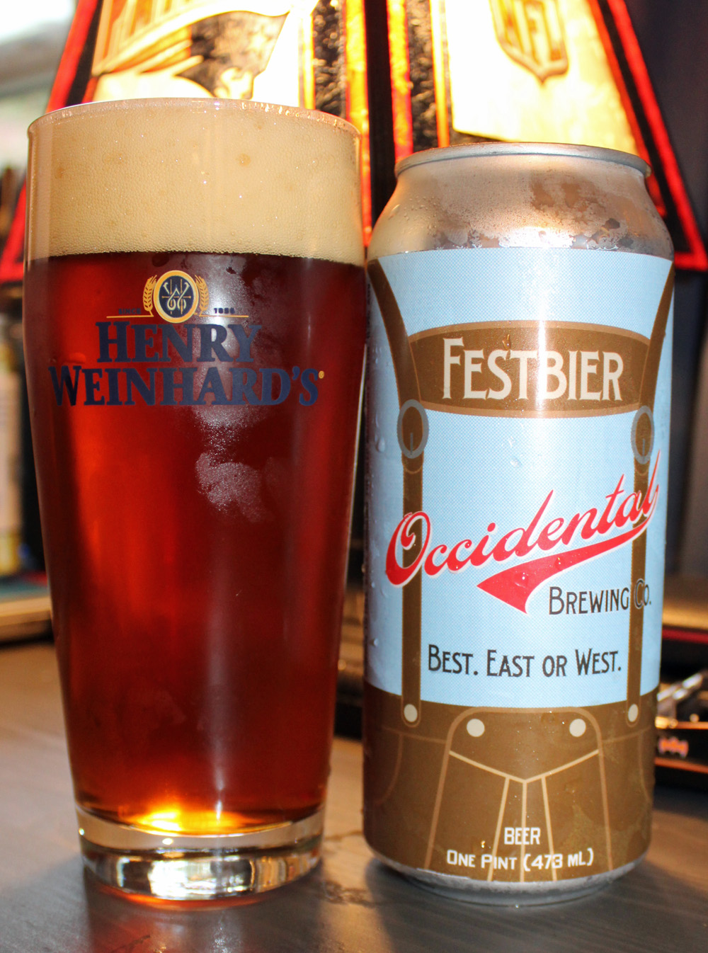 Occidental Festbier. Surprise! It’s a Märzen! As everybody should know by now, there are (and have been for a few decades now) two kinds of Oktoberfest beer: Märzen, the original and my personal favorite, and Festbier, a paler, usually stronger version that is the most common at the Munich Oktoberfest today. When I hear the name Festbier, I expect the latter, but Occidental put one over on me.