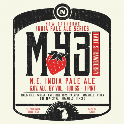 A tart variation of our flagship New England IPA, M-43, Tart Strawberry M-43 has the same taste and haziness you know and love with subtle additions of strawberry aroma, flavor, and tartness to accentuate that addition. With its combination of Calypso, Simcoe, Citra, and Amarillo hops. Citrus and tropical notes of Pineapple, Mango, and Grapefruit come through in the huge, yet surprisingly delicate aroma.