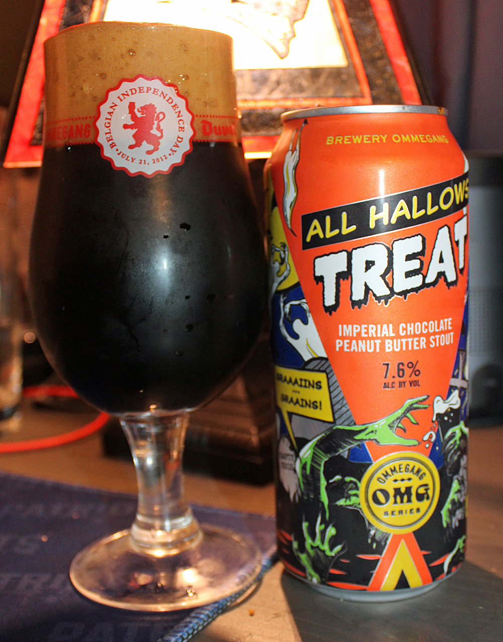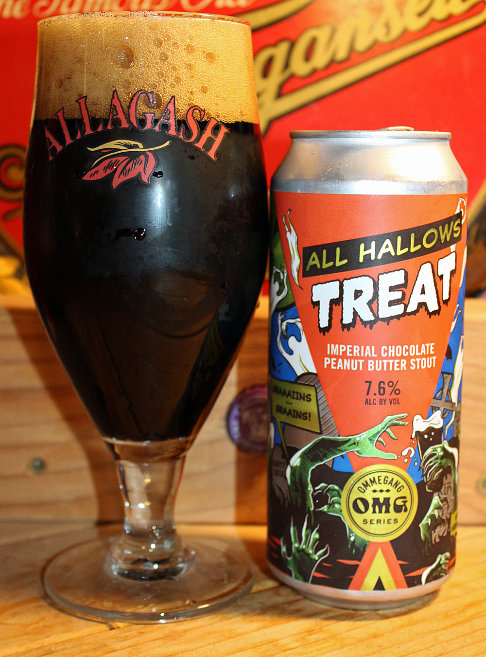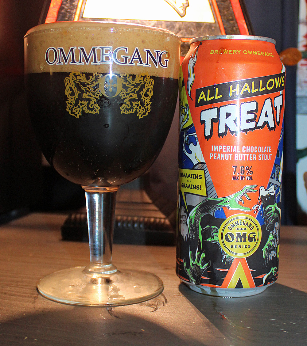 A few years ago, I picked up a can of Ommegang All Hallow’s Treat Imperial Chocolate Peanut Butter Stout. I loved the hell out of that beer, but for some reason I thought it was brewed by Allagash (not Ommegang), and you can see the results of that error in the photos below. I hadn’t seen the beer for a while, but this year I did, and so I bought some, this time to be enjoyed from the correct glass.