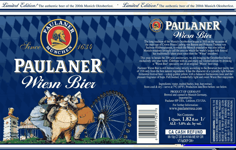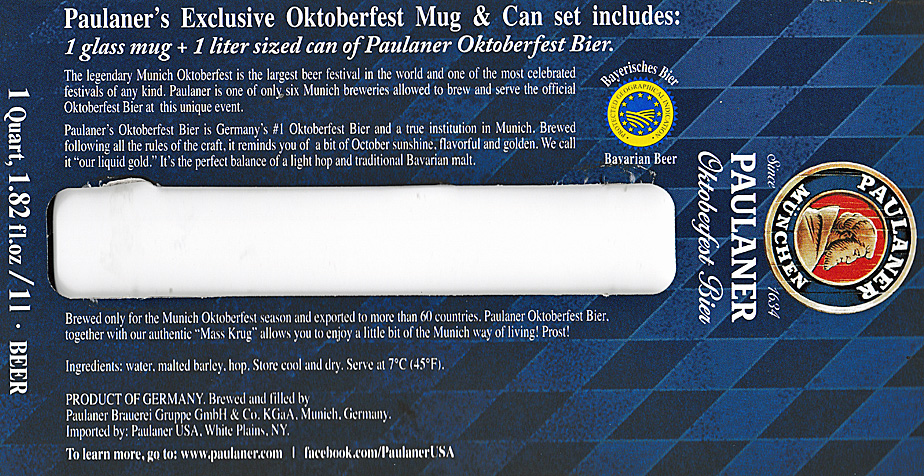 Paulaner Oktoberfest Bier is sold in bottles, though I have not seen these for a few years now. Perhaps the best way to enjoy this beer, though, is by purchasing a Liter can paired with an authentic Paulaner Maß (one liter glass) just like those beer is served in at Oktoberfest!