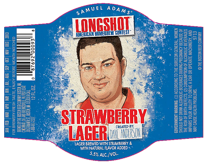 Congratulations, Dave Anderson! Not only did your homebrew recipe make it into the 2013 Samuel Adams Longshot sampler as Samuel Adams Longshot Strawberry Lager, but it also just happened to be the best beer in the assortment, at least in the opinion of this seasoned old beer reviewer. Longshot Strawberry Lager was definitely much tastier than the chalky Beerflower Wheat (yuck), and I think a bit more balanced than Magnificent Seven, a double/imperial IPA.