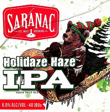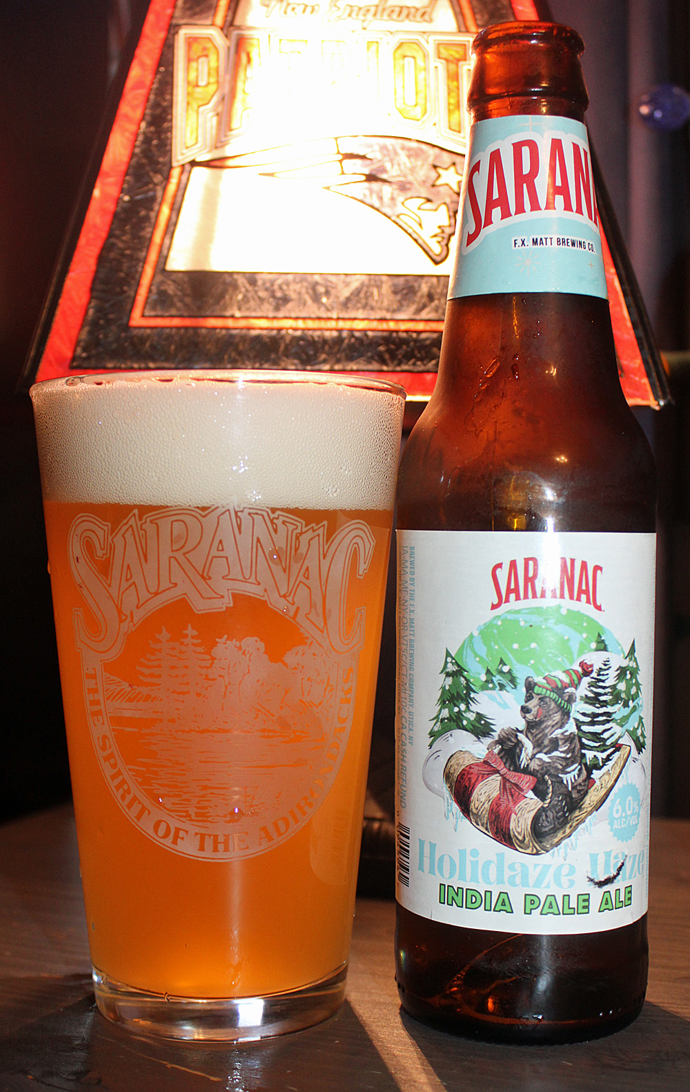 And the beer I am here to talk about today, Saranac Holidaze Haze India Pale Ale. This is the first new (to me anyway) Saranac beer I have had in quite some time, and as you may imagine from my intro, I have been drinking Saranac beer for quite some time. Holidaze Haze India Pale Ale is available by itself in 12-packs as well it should be noted.
