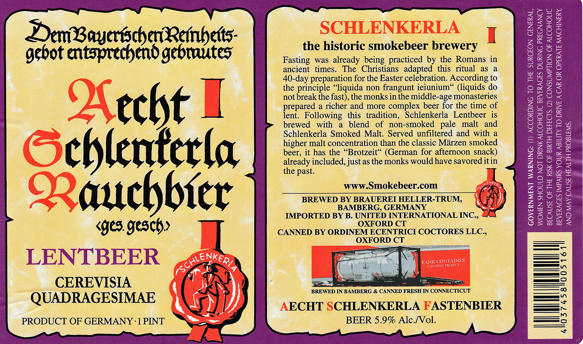 For the US market, draft Lentbeer is shipped to Oxford, Connecticut where it is canned by Ordinem Ecentrici Coctores. If memory serves, this is the only unfiltered Schlenkerla rauchbier I have come across.