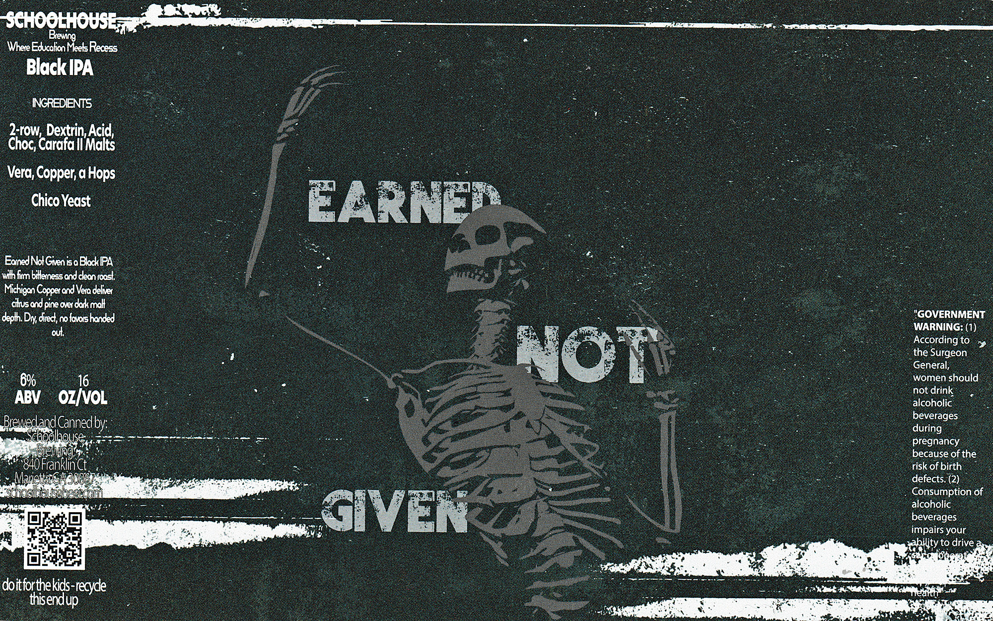 Earned Not Given is a back IPA with firm bitterness clean roast. Michigan Copper and Vera deliver citrus and pine over dark malt depth. Dry, direct, no favors handed out.