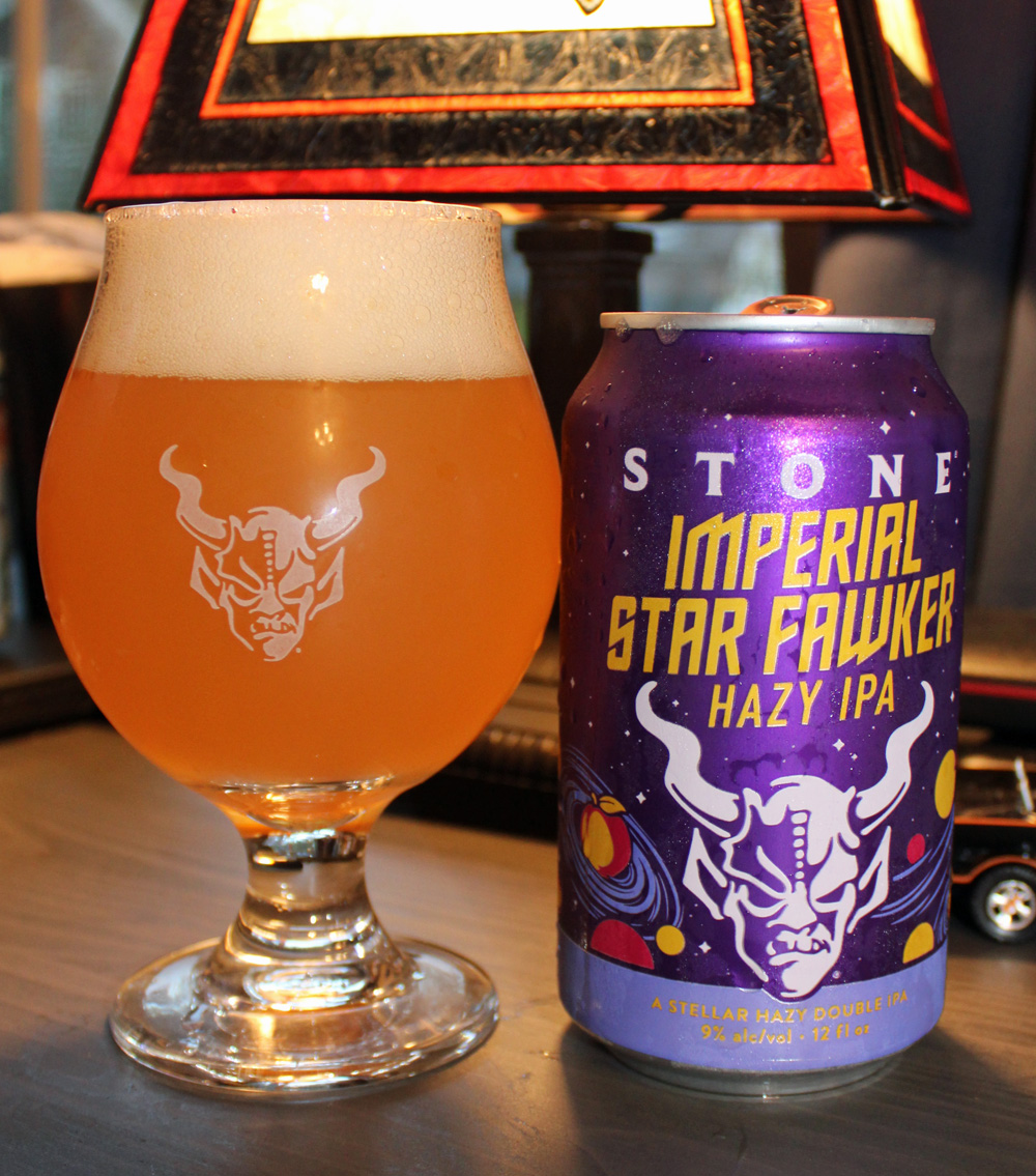 Stone Imperial Star Fawker Hazy IPA pours to a hazy orange color with a thick fluffy head and a nose of grapefruit rind and stone fruit. Taking a sip, the beer is medium in body, with light caramel malt more than average for the style. It is slightly dank, with green leafy notes, then comes juicy orange citrus and grapefruit rind. Finishes moderately bitter with a bit of alcohol warmth, and I like it a lot.