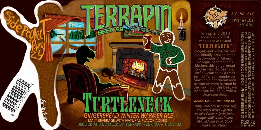 Terrapin’s 2014 homebrew contest winners have created “Turtleneck” gingerbread winter warmer ale. Initially brewed in the backwoods of Athens, Georgia, or someone’s kitchen, this gingerbread cookie inspired beer was artfully crafted by a crack team of Terrapin employees. Since no gingerbread men or women were harmed in the making of this beer, we hope you will enjoy with a clear conscience.