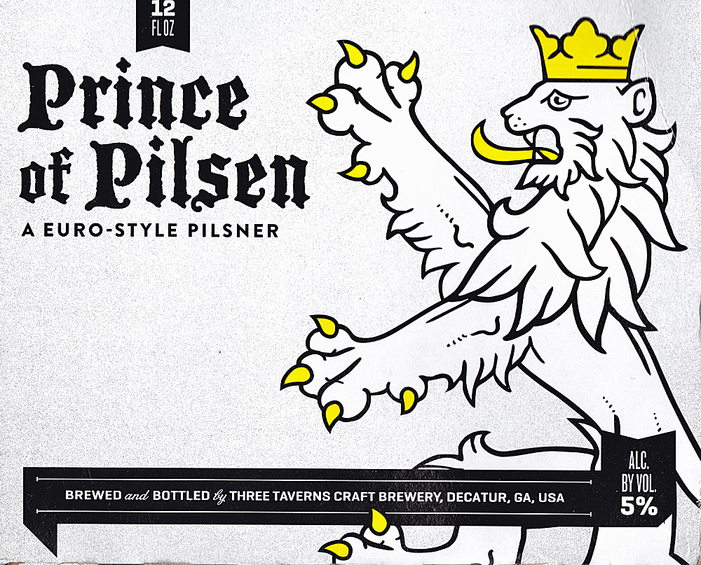 Anyway, the other day I walked into Bullock’s Wine and Spirits in Woodstock, Georgia and saw my first ever six-pack of Three Taverns beer (most of the ones I’ve seen have been 4-packs and 750s). This distinction goes to Three Taverns Prince of Pilsen, a “Euro-Style Pilsner” as they call it on the label. Which is a good thing, because 4-packs and pilsner just seem completely incongruous to me.