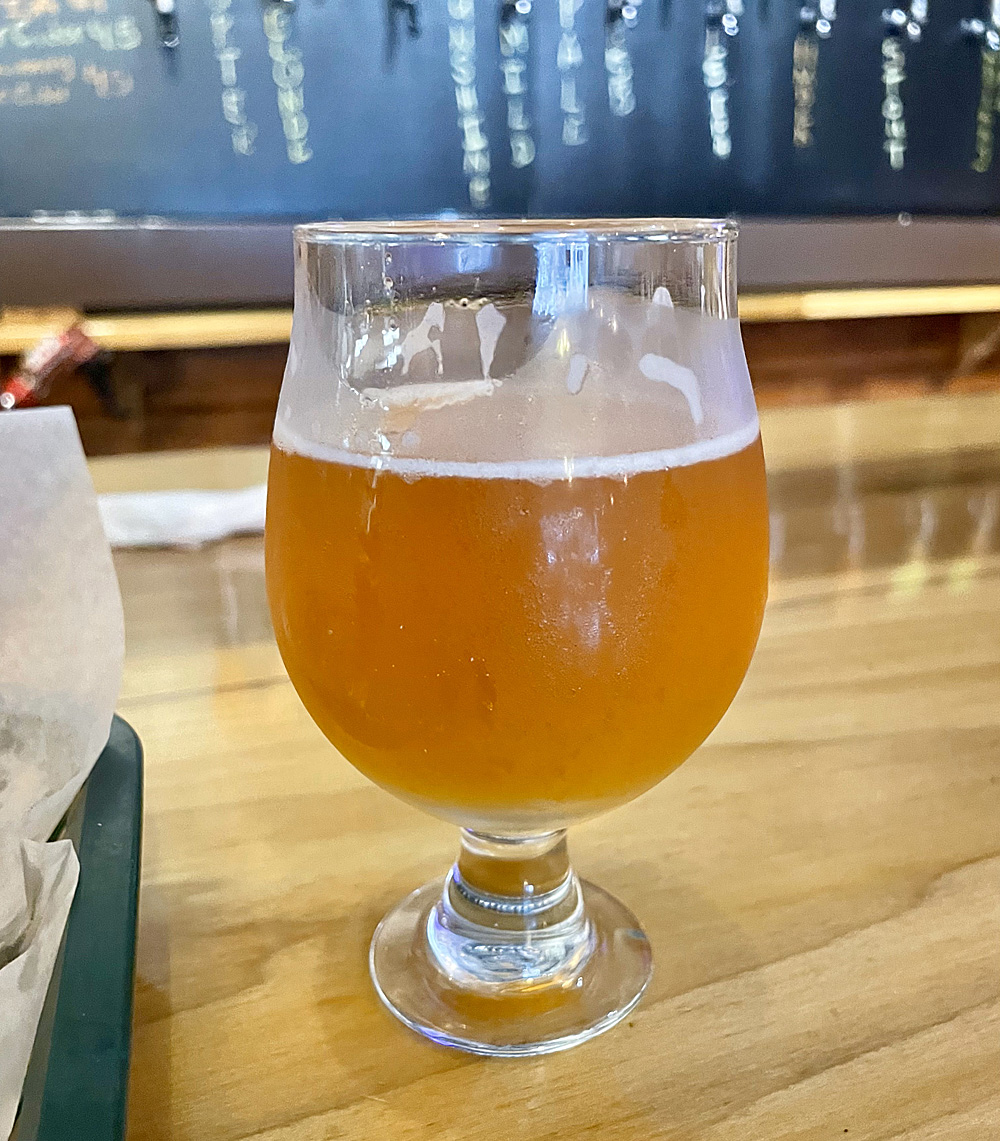 Next up was another half pint, this time of Sunshine IPA, a classic American/ West Coast IPA. Classic American West Coast IPAs of the piney resiny variety are all over western North Carolina, and I love them. Sunshine IPA is a tasty one, with a firm caramel malt backbone and moderate notes of citrus and resiny pine. It finishes mildly bitter. It has an alcohol content of 7.5% by volume and was running $7 a pint when I visited.