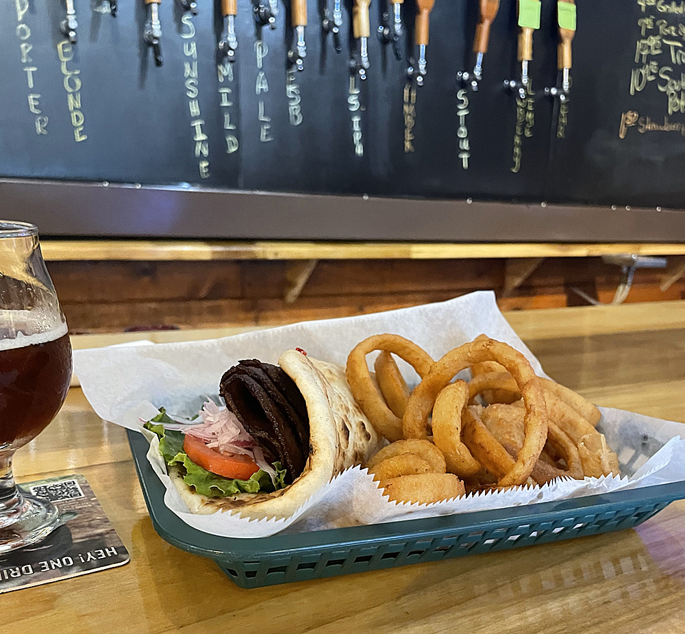 I had not eaten since breakfast and it was almost 4PM, so I ordered a Gyro with onion rings for about $14 and a half pint of Green Dragon ESB. I love that they offer half pints here. A sampler is not enough, and when you want to enjoy a few but have to drive, a pint can be too much.