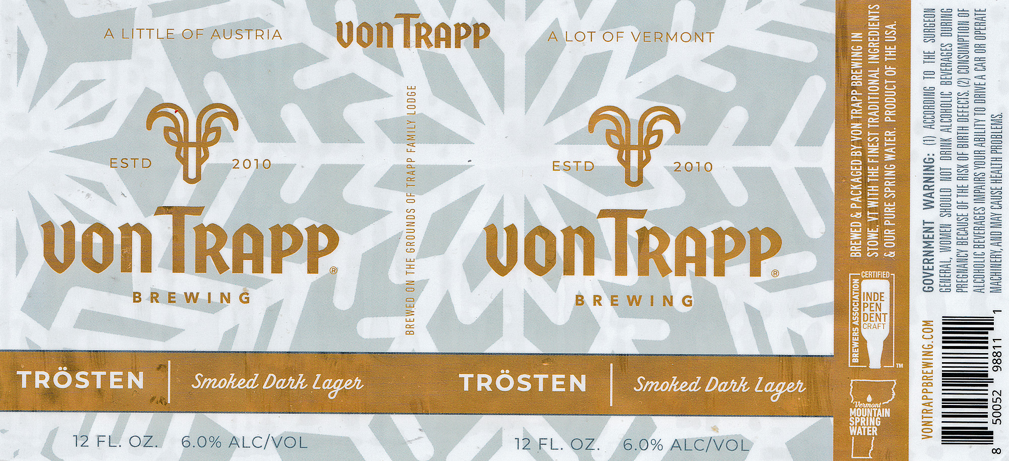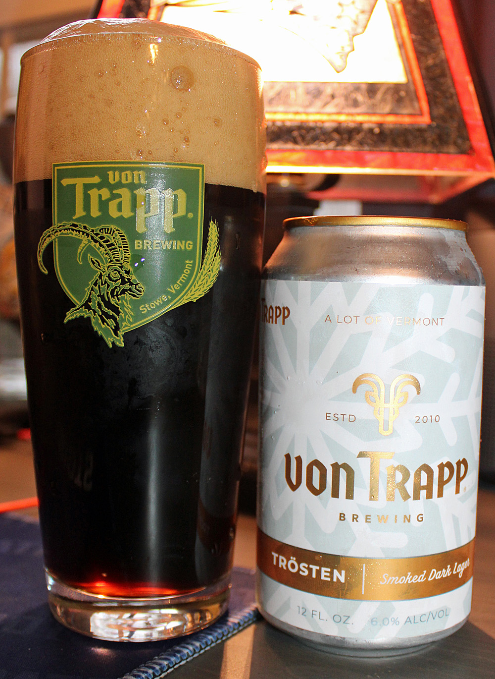 Those wonderful folks at Von Trapp Brewing of Stowe, Vermont, sure do love their Rauchbiers. Have I mentioned I love Rauchbiers? I do! Rauchbier, or smoked beer, is one of my favorite styles, and so far I have enjoyed three delightful Rauchbiers from Von Trapp: the legendary Maple Rauch from their Stowe Style series, a delightful Smoked Helles, and the beer I am here to speak of today, Von Trapp Trösten Smoked Lager.