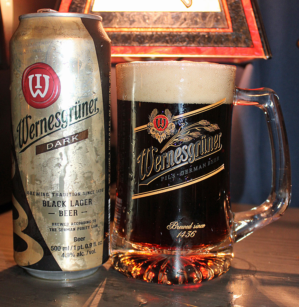 Wernesgrüner Dark has an alcohol content of 4.9% by volume and I paid $6.99 for four half liter cans at Aldi. They call this a black lager on the label, though it is not really a Schwarzbier in color or character. It’s more a Munich Dunkel. My cans are stamped 08.28.2026 on the bottom.