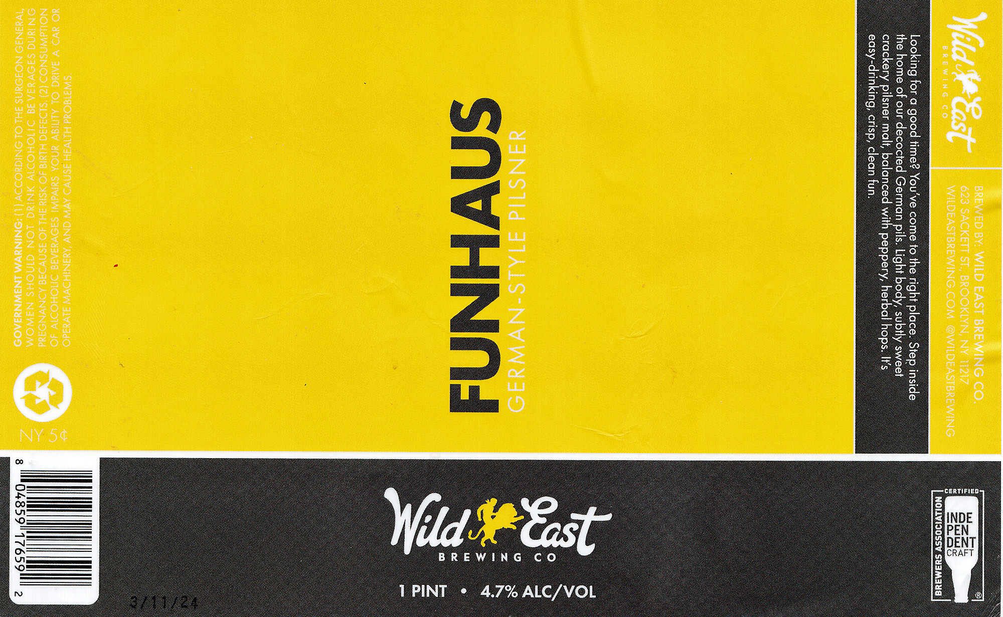 Wild East Funhaus German-Style Pilsner pours to a light straw color with a towering white head of foam and a nose of crisp biscuity pilsner malt. Taking a sip, the crisp biscuity malt is as present in the palate as it is in the nose. The beer bursts with fresh malt from the kiln flavor, followed by a sharp grassy hop bingers that lingers long and leaves the beer dry.