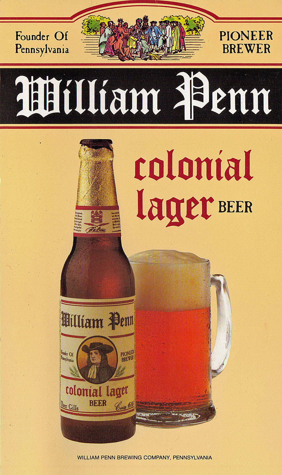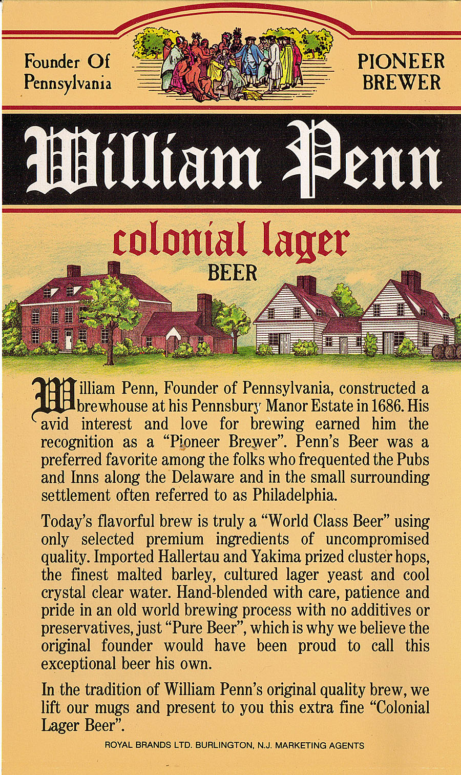 I remember picking up a six-pack while honeymooning in Philadelphia in December of 1988. William Penn Colonial Lager was sold in very attractively packaged bottles. I never saw it sold outside of Pennsylvania or New Jersey, and now, of course, the beer is not sold at all. But it was a very crisp, drinkable all malt lager with a nicely balanced hop finish. Like William Penn the man, William Penn the beer was a pioneer for its day, even if it was likely nothing like the ales it's namesake would have turned out.
